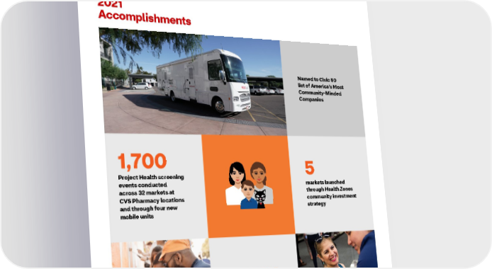 2021 ESG Report Healthy Community 2021 Accomplishments Named to Civic 50 list of America’s Most Community-Minded Companies 1,700 5 Project Health screening events conducted markets launched across 32 markets at through Health Zones CVS Pharmacy locations community investment and through four new strategy mobile units $2.5M value of volunteerism donated by colleagues 44