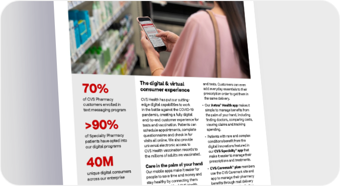 2021 ESG Report Healthy People The digital & virtual and tests. Customers can even 70% consumer experience add everyday essentials to their prescription order to get them in of CVS Pharmacy CVS Health has put our cutting- the same delivery. customers enrolled in edge digital capabilities to work • Our Aetna® Health app makes it text messaging program in the battle against the COVID-19 simple to manage benefits from pandemic, creating a fully digital the palm of your hand, including end-to-end customer experience for finding doctors, comparing costs, >90% tests and vaccination. Patients can viewing claims and tracking schedule appointments, complete spending. of Specialty Pharmacy questionnaires and check in for • Patients with rare and complex patients have opted into visits all online. We also provide conditions benefit from the our digital programs universal electronic access to digital innovations featured in CVS Health vaccination records to our CVS Specialty® app that 40M the millions of adults we vaccinated. make it easier to manage their Care in the palm of your hand prescriptions and treatments. unique digital consumers Our mobile apps make it easier for • CVS Caremark® plan members across our enterprise people to save time and money and use the CVS Caremark site and stay healthy by connecting them app to manage their pharmacy to the full breadth of CVS Health benefits through mail delivery 2B+ products and services anytime, or in-store service, like finding digital visits anywhere. out how much a prescription will cost and checking for lower-cost • The CVS Pharmacy app includes alternatives. prescription information and refill options, ExtraCare® offers, mobile payment, delivery services and appointment scheduling for health services such as vaccination 11