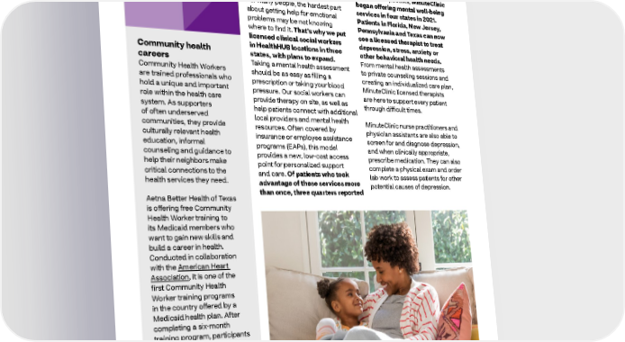 2021 ESG Report Healthy People Caring for the whole fewer symptoms of depression person after an average of 3.5 visits. Mental health professionals To better serve the holistic health on site needs of our patients, MinuteClinic For many people, the hardest part began offering mental well-being about getting help for emotional services in four states in 2021. problems may be not knowing Patients in Florida, New Jersey, where to find it. That’s why we put Pennsylvania and Texas can now licensed clinical social workers see a licensed therapist to treat in HealthHUB locations in three depression, stress, anxiety or Community health states, with plans to expand. other behavioral health needs. careers Taking a mental health assessment From mental health assessments Community Health Workers should be as easy as filling a to private counseling sessions and are trained professionals who prescription or taking your blood creating an individualized care plan, hold a unique and important pressure. Our social workers can MinuteClinic licensed therapists role within the health care provide therapy on site, as well as are here to support every patient system. As supporters help patients connect with additional through difficult times. of often underserved local providers and mental health MinuteClinic nurse practitioners and communities, they provide resources. Often covered by physician assistants are also able to culturally relevant health insurance or employee assistance screen for and diagnose depression, education, informal programs (EAPs), this model and when clinically appropriate, counseling and guidance to provides a new, low-cost access prescribe medication. They can also help their neighbors make point for personalized support complete a physical exam and order critical connections to the and care. Of patients who took lab work to assess patients for other health services they need. advantage of these services more potential causes of depression. Aetna Better Health of Texas than once, three quarters reported is offering free Community Health Worker training to its Medicaid members who want to gain new skills and build a career in health. Conducted in collaboration with the American Heart Association, it is one of the first Community Health Worker training programs in the country offered by a Medicaid health plan. After completing a six-month training program, participants will receive a completion certificate and join the ranks of Community Health Workers as community advocates and agents of social change. 20