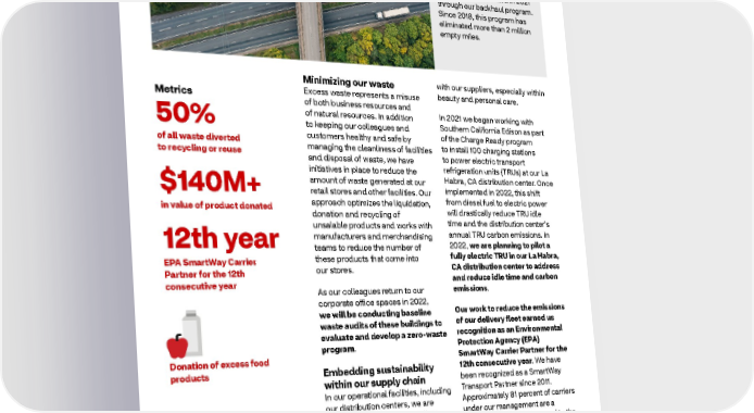 2021 ESG Report Healthy Planet 500K empty miles eliminated in 2021 through our backhaul program. Since 2018, this program has eliminated more than 2 million empty miles. Minimizing our waste with our suppliers, especially within Metrics Excess waste represents a misuse beauty and personal care. of both business resources and of natural resources. In addition In 2021 we began working with 50% to keeping our colleagues and Southern California Edison as part of all waste diverted customers healthy and safe by of the Charge Ready program to recycling or reuse managing the cleanliness of facilities to install 100 charging stations and disposal of waste, we have to power electric transport initiatives in place to reduce the refrigeration units (TRUs) at our La amount of waste generated at our Habra, CA distribution center. Once $140M+ retail stores and other facilities. Our implemented in 2022, this shift in value of product donated approach optimizes the liquidation, from diesel fuel to electric power donation and recycling of will drastically reduce TRU idle unsalable products and works with time and the distribution center’s 12th year manufacturers and merchandising annual TRU carbon emissions. In teams to reduce the number of 2022, we are planning to pilot a EPA SmartWay Carrier these products that come into fully electric TRU in our La Habra, Partner for the 12th our stores. CA distribution center to address consecutive year and reduce idle time and carbon As our colleagues return to our emissions. corporate office spaces in 2022, we will be conducting baseline Our work to reduce the emissions waste audits of these buildings to of our delivery fleet earned us evaluate and develop a zero-waste recognition as an Environmental program. Protection Agency (EPA) Donation of excess food SmartWay Carrier Partner for the products Embedding sustainability 12th consecutive year. We have within our supply chain been recognized as a SmartWay In our operational facilities, including Transport Partner since 2011. our distribution centers, we are Approximately 81 percent of carriers actively engaging with suppliers under our management are a to identify options to reduce SmartWay partner, compared to the unnecessary packaging in items industry average of 78 percent. Landfill diversion of we receive. We have been focusing unsalable items especially on removing internal packaging like plastic wrap or extra cardboard and see an opportunity to reduce paper and plastic use 63