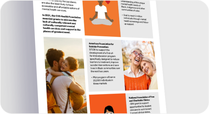 2021 ESG Report Healthy Community Improving mental health care for all Mental Health America: One of the key health impacts of $500K in support of a year- the COVID-19 pandemic has been long project to improve a strain on the mental health of the examination and children and adults. In addition, understanding of the unique some of the communities that have mental health needs of been hit hardest by the pandemic Black, Indigenous and other are also the least likely to have communities of color. accessible and affordable options of mental health services. • Goal to reach 2 million individuals through mental In 2021, the CVS Health Foundation health screenings and follow- awarded grants to address the up support lack of culturally relevant and culturally competent mental health services and support in the places of greatest need. American Foundation for Suicide Prevention: $750K to support the development of a first-of- its-kind education program specifically designed to reduce barriers to treatment, improve suicide interventions and save lives in Black communities over the next two years. • Pilot program will serve 20,000 individuals in three markets National Association of Free and Charitable Clinics: ~$1M grant to support opportunities for student clinicians to work toward licensed clinical status, strengthening the behavioral health workforce in underserved communities 47
