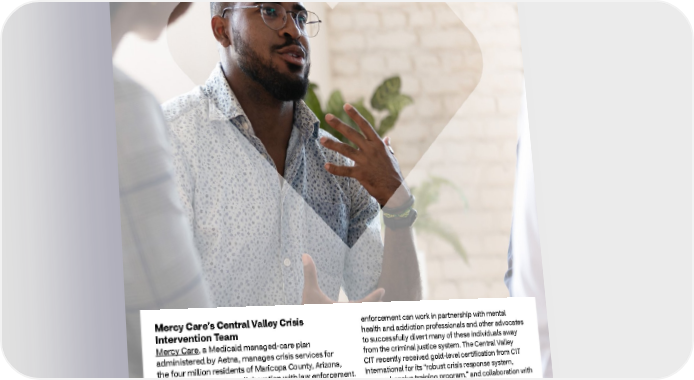 2021 ESG Report Healthy People Mercy Care’s Central Valley Crisis enforcement can work in partnership with mental Intervention Team health and addiction professionals and other advocates Mercy Care, a Medicaid managed-care plan to successfully divert many of these individuals away administered by Aetna, manages crisis services for from the criminal justice system. The Central Valley the four million residents of Maricopa County, Arizona, CIT recently received gold-level certification from CIT including community collaboration with law enforcement. International for its “robust crisis response system, Part of that collaboration is the Central Valley Crisis comprehensive training program,” and collaboration with Intervention Team (CIT) program, which trains Phoenix behavioral health providers. and Tempe police officers to deescalate situations with people who are experiencing a behavioral health crisis. Understanding the difficulties communities of color face in accessing quality behavioral health care, The higher rate of undiagnosed and untreated mental we partnered with leading nonprofits in 2021 to illness among people of color — which is largely strengthen culturally competent delivery of mental due to socioeconomic, racial, and health disparities health services. You can read more about those — increases their chances of interacting with the partnerships in the Healthy Community section police. With the necessary knowledge and skills, law of this report. 24