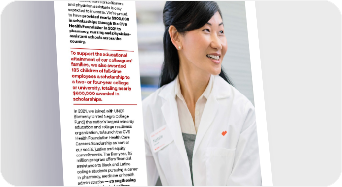 2021 ESG Report Healthy Community Scholarships for future health professionals Building a stellar workforce begins with investing in the health care leaders of tomorrow. The demand for highly skilled health professionals, including pharmacists, nurse practitioners and physician assistants is only expected to increase. We’re proud to have provided nearly $900,000 in scholarships through the CVS Health Foundation in 2021 to pharmacy, nursing and physician- assistant schools across the country. To support the educational attainment of our colleagues’ families, we also awarded 185 children of full-time employees a scholarship to a two- or four-year college or university, totaling nearly $600,000 awarded in scholarships. In 2021, we joined with UNCF (formerly United Negro College Fund) the nation’s largest minority education and college readiness organization, to launch the CVS Health Foundation Health Care Careers Scholarship as part of our social justice and equity commitments. The five-year, $5 million program offers financial assistance to Black and Latino college students pursuing a career in pharmacy, medicine or health administration — strengthening the pool of talented college graduates ready to join the health care workforce. In the first year of awards, the program granted scholarships to 45 students. 50