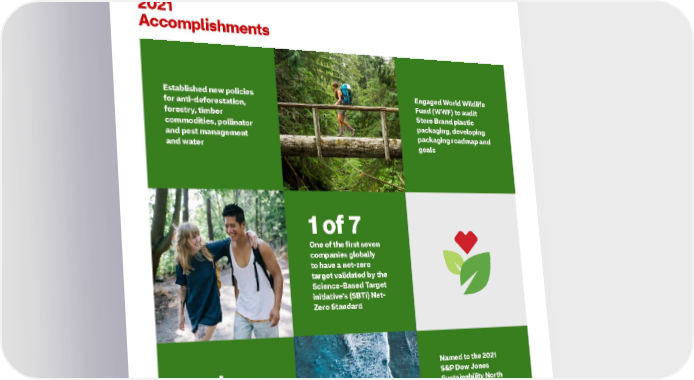 2021 ESG Report Healthy Planet 2021 Accomplishments Established new policies Engaged World Wildlife for anti-deforestation, Fund (WWF) to audit forestry, timber Store Brand plastic commodities, pollinator packaging, developing and pest management packaging roadmap and and water goals 1 of 7 One of the first seven companies globally to have a net-zero target validated by the Science-Based Target initiative’s (SBTi) Net- Zero Standard Named to the 2021 3rd year S&P Dow Jones Sustainability North Third consecutive year American Index for the recognized on CDP’s ninth consecutive year Climate A-List and as a and the Dow Jones Supplier Engagement Sustainability World Leader Index for the third consecutive year 57