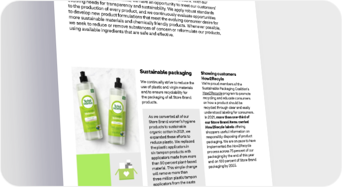 2021 ESG Report Healthy Planet Products & Packaging — Sustainable Products, Sustainably Sourced We believe in providing our customers with products that meet the highest level of quality and safety, developed with respect for our environment. With our exclusive Store Brand products, we have an opportunity to meet our customers’ evolving needs for transparency and sustainability. We apply robust standards to the production of every product, and we continuously evaluate opportunities to develop new product formulations that meet the evolving consumer desire for more sustainable materials and chemically friendly products. Whenever possible, we seek to reduce or remove substances of concern or reformulate our products, using available ingredients that are safe and effective. Sustainable packaging Showing customers How2Recyle We continually strive to reduce the We’re proud members of the use of plastic and virgin materials Sustainable Packaging Coalition’s and to ensure recyclability for How2Recycle program to promote the packaging of all Store Brand recycling and educate consumers products. on how a product should be recycled through clear and easily understood labeling for consumers. As we converted all of our In 2021, more than one-third of Store Brand women’s hygiene our Store Brand items carried products to sustainable How2Recyle labels offering organic cotton in 2021, we shoppers useful information on expanded these efforts to responsibly disposing of product reduce plastic. We replaced packaging. We are on pace to have the plastic applicators in implemented the How2Recycle six tampon products with process across 75 percent of our applicators made from more packaging by the end of this year than 90 percent plant-based and on 100 percent of Store Brand material. This simple change packaging by 2025. will remove more than three million plastic tampon applicators from the waste stream every year. 64