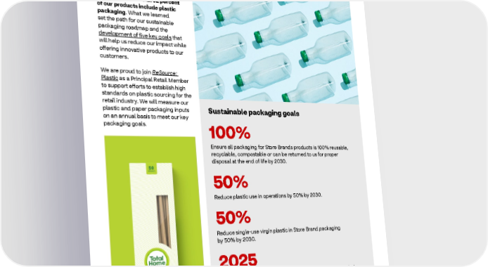 2021 ESG Report Healthy Planet Building collaborations to tackle plastic In 2021 we joined forces with WWF to complete an audit of plastic packaging within our Store Brand product portfolio. The audit showed that 62 percent of our products include plastic packaging. What we learned set the path for our sustainable packaging roadmap and the development of five key goals that will help us reduce our impact while offering innovative products to our customers. We are proud to join ReSource: Plastic as a Principal Retail Member to support efforts to establish high standards on plastic sourcing for the retail industry. We will measure our plastic and paper packaging inputs Sustainable packaging goals on an annual basis to meet our key packaging goals. 100% Ensure all packaging for Store Brands products is 100% reusable, recyclable, compostable or can be returned to us for proper disposal at the end of life by 2030. 50% Reduce plastic use in operations by 50% by 2030. 50% Reduce single-use virgin plastic in Store Brand packaging by 50% by 2030. 2025 Ensure all Store Brand paper-based packaging is from recycled or certified sustainably sourced content by 2025. 2023 By 2023, define a list of packaging to be designated as problematic or unnecessary and take measures to eliminate them by 2030. 65