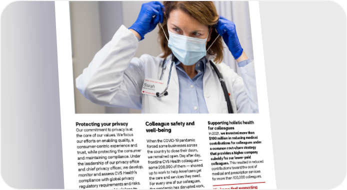 2021 ESG Report Healthy Business Protecting your privacy Colleague safety and Supporting holistic health Our commitment to privacy is at well-being for colleagues the core of our values. We focus In 2021, we invested more than our efforts on enabling quality, a When the COVID-19 pandemic $100 million in reducing medical consumer-centric experience and forced some businesses across contributions for colleagues under trust, while protecting the consumer the country to close their doors, a common cost-share strategy and maintaining compliance. Under we remained open. Day after day, that provides a higher company the leadership of our privacy office frontline CVS Health colleagues — subsidy for our lower-paid and chief privacy officer, we develop, some 200,000 of them — showed colleagues. This resulted in reduced monitor and assess CVS Health’s up to work to help Americans get contributions toward the cost of compliance with global privacy the care and services they need. medical and prescription services regulatory requirements and risks. For every one of our colleagues, for more than 100,000 colleagues. We provide annual trainings to the pandemic has disrupted work, all CVS Health colleagues on travel, and home life. For many, it We know that supporting key privacy topics, including has brought illness, anxiety or grief. the mental well-being of management of personal health our colleagues is just as information (PHI) and personally For additional details on the tools, important as the behavioral identifiable information (PII). policies and benefits put in place to health offerings we provide keep our colleagues safe throughout our customers and patients. More information on our privacy the pandemic and respond to their programs can be found in our Code needs, please read our 2021 COVID of Conduct. Response Report. 39