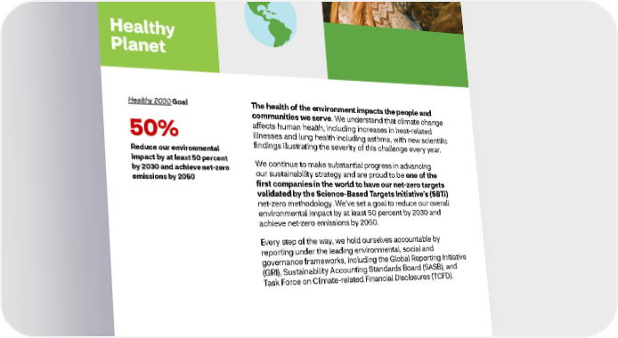 2021 ESG Report Healthy Planet Healthy 2030 Goal The health of the environment impacts the people and communities we serve. We understand that climate change affects human health, including increases in heat-related 50% illnesses and lung health including asthma, with new scientific Reduce our environmental findings illustrating the severity of this challenge every year. impact by at least 50 percent We continue to make substantial progress in advancing by 2030 and achieve net-zero our sustainability strategy and are proud to be one of the emissions by 2050 first companies in the world to have our net-zero targets validated by the Science-Based Targets Initiative’s (SBTi) net-zero methodology. We’ve set a goal to reduce our overall environmental impact by at least 50 percent by 2030 and achieve net-zero emissions by 2050. Every step of the way, we hold ourselves accountable by reporting under the leading environmental, social and governance frameworks, including the Global Reporting Initiative (GRI), Sustainability Accounting Standards Board (SASB), and Task Force on Climate-related Financial Disclosures (TCFD). 56
