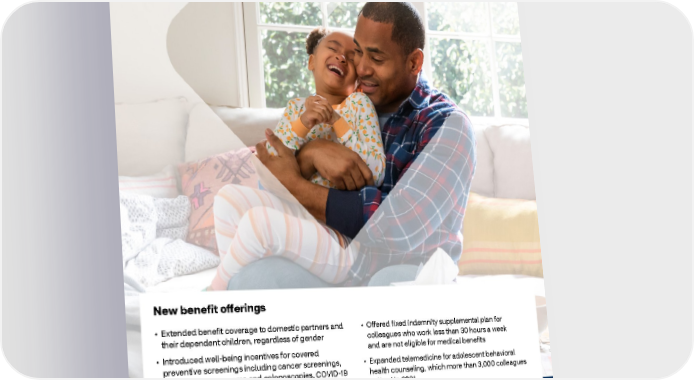 2021 ESG Report Healthy Business New benefit offerings • Extended benefit coverage to domestic partners and • Offered fixed indemnity supplemental plan for their dependent children, regardless of gender colleagues who work less than 30 hours a week • Introduced well-being incentives for covered and are not eligible for medical benefits preventive screenings including cancer screenings, • Expanded telemedicine for adolescent behavioral such as mammograms and colonoscopies, COVID-19 health counseling, which more than 3,000 colleagues vaccination and maternity program engagement utilized in 2021 • Re-introduced back-up care for store colleagues, which allows them to reserve center-based or in-home care through the Bright Horizons network for their 115K dependents (children or elders) should there be a colleagues participated in disruption in regular care. online fitness class offerings • Added the Family Building Benefit for colleagues to access doula services 38