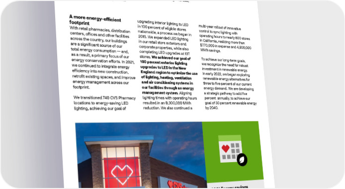 2021 ESG Report Healthy Planet Sustainable Operations — Reducing Resource Consumption Throughout 2021, we piloted innovative sustainability solutions to reduce the resources we consume and the waste we generate, especially paper and plastic. A more energy-efficient upgrading interior lighting to LED multi-year rollout of innovative footprint in 100 percent of eligible stores control to sync lighting with With retail pharmacies, distribution nationwide, a process we began in operating hours to nearly 800 stores centers, offices and other facilities 2015. We expanded LED lighting in California, realizing more than across the country, our buildings in our retail store exteriors and $770,000 in expense and 4,800,000 are a significant source of our corporate properties, while also MWh savings. total energy consumption — and, completing LED upgrades at 137 as a result, a primary focus of our stores. We achieved our goal of To achieve our long-term goals, energy conservation efforts. In 2021, 100 percent exterior lighting we recognize the need for robust we continued to integrate energy upgrades to LED in the New investment in renewable energy. efficiency into new construction, England region to optimize the use In early 2022, we began exploring retrofit existing spaces, and improve of lighting, heating, ventilation renewable energy alternatives for energy management across our and air conditioning systems in three to five percent of our current footprint. our facilities through an energy energy demand. We are developing management system. Aligning a strategic pathway to add five We transitioned 740 CVS Pharmacy lighting times with operating hours percent annually, to achieve our locations to energy-saving LED resulted in an 8,300,000 MWh goal of 50 percent renewable energy lighting, achieving our goal of reduction. We also continued a by 2040. 2021 Energy savings 33.5K MWh — more than the energy needed to power 3,000 homes for a year 59