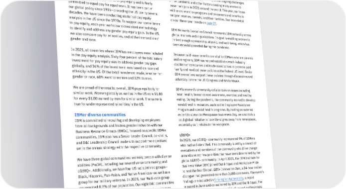 Women We grew representation of women globally by 3.7 points from 2020 to 2021, and hiring increased 2.3 points. We were impacted by attrition, due primarily to the ongoing challenges of the pandemic and other factors causing many women to leave their jobs in 2021 around the world. This year, our focus will be on retention programs and on careers and benefits to support women, parents, and their families. See more detail on our three-year trends on page 27 . IBM Women’s Executive Council represents IBM culturally across global markets and organizations. Its goal is enabling women to thrive through sponsorship, allyship, and well-being, which has been especially needed during the pandemic. Because paid-leave benefits are vital for IBMers who are parents and caregivers, IBM has helped establish a multi-industry coalition of companies and trade associations to promote paid family and medical leave policies at the federal US level. Senior IBM executives support these policies through discussions and advocacy before the US Congress and White House. IBM’s women’s community collaborates on issues including heart health, breast cancer awareness, exercise, and healthy eating. During the pandemic, the community worked to develop mental health resources, such as the Employee Assistance Program and special health programs. By inviting an external expert to speak on Menopause Awareness Day, we also took a bold global initiative to take the stigma away from menopause, especially as it relates to the workplace. LGBTQ+ In 2021, our LGBTQ+ community represented 9% of IBMers who had self-identified. This community is led by a council of executives and members of the community who drive change around a select few priorities that have been determined by the global LGBTQ+ community. In April 2021, the IBM Institute for Business Value (IBV) joined Out & Equal and Workplace Pride to host the first Global LGBT+ Innovation Jam, a 34-hour online dialogue that generated more than 2,800 comments. The event’s findings are included in Striving for Authenticity , a report released in June and co-authored by IBM and Out & Equal. The report also includes a survey of 6,000 US-based professionals, conducted by the IBV and Oxford Economics. The survey found that despite legal progress and efforts by employers, discrimination in the workplace remains a reality. The report includes recommendations for organizations to improve LGBTQ+ inclusion. Pay equity Paying people fairly based on their job and without discrimination—regardless of gender or race—is not optional. It is a mandate that aligns with our values. IBM has a longstanding practice of pay equity and is firmly committed to equal pay for equal work. It has been part of our global policy since 1935—preceding the US law by several decades. We have been conducting statistical pay equity analysis in the US since the 1970s. To support our commitment to pay equity, each year we follow a consistent methodology to identify and address any gender pay equity gaps. In the US, we also compare pay for minorities, and at the intersection of gender and race. In 2021, all countries where IBM has employees were included in the pay equity analysis. Sixty-four percent of the total salary investment for pay equity was to address gender pay gaps globally, and 36% of the investment was based on race and ethnicity in the US. Of the total investment made, whether for gender or race, 68% went to women and 32% to men. We are proud of the results: overall, IBM pays equitably for similar work. Women globally as well as in the US earn $1.00 for every $1.00 earned by men for similar work. The same is true for underrepresented minorities in the US. IBMer diverse communities IBM is committed to recruiting and developing employees from all backgrounds and fosters greater inclusion with our Business Resource Groups (BRGs), focused on specific IBMer communities. IBM also has a Senior Leader Council, co-chairs, and D&I Leadership Council leaders to support the objectives set in the annual strategy with the respective community. We have three global communities: women; people with diverse abilities (PwDA), including our neurodiverse community; and LGBTQ+. Additionally, we have four US racial/ethnic groups— Black, Hispanic, Pan-Asian, and Native American—as well as a group for our military veterans. In 2021, our Multi-race group represented 0.7% of our population. Our eight D&I communities support over 300 BRGs globally across 47 countries with over 32,000 IBMers actively participating in programs, events, and other D&I initiatives. We had 13 new BRGs established in countries including the US, Turkey, Argentina, Brazil, Mexico, and Poland. Following are highlights of how we bring our culture of inclusion to life across our eight communities and countries. 23 IBM 2021 ESG Report