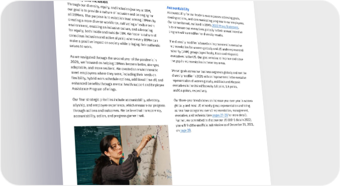 Accountability Accountability for our leaders encompasses achieving goals, owning actions, and communicating progress to our employees. Our commitment, outlined in IBM’s 2022 Proxy Statement , is to measure our executives globally in their annual incentive program with a modifier for diversity results. The diversity modifier is based on improvement in executive representation for women globally and US underrepresented minority (URM) groups (specifically, Black and Hispanic) executives in the US. Our goal remains to improve and close the gap in representation in these key areas. We set goals across our business segments globally and met the diversity modifier in 2021 with an improvement in the executive representation of women globally, and Black and Hispanic executives in the United States by 1.0 point, 1.5 points, and 0.4 points, respectively. Our three-year trend shows an increase year over year in women globally and most US minority group representation and hiring across four categories: overall representation, management, executive, and technical (see pages 27-28 for more detail). Further, we committed to disclose our US EEO-1 data in 2022; you will find the unofficial submission as of December 31, 2021, on page 28 . Equitable impact ↗ Diversity and inclusion Through our diversity, equity, and inclusion journey at IBM, our goal is to provide a culture of inclusion and belonging for all IBMers. The purpose is to establish trust among IBMers by creating a more diverse workforce, cultivating a flexible work environment, enabling an inclusive culture, and advocating for equity, both inside and outside IBM. We foster a culture of conscious inclusion and active allyship where every IBMer can make a positive impact on society while bringing their authentic selves to work. As we navigated through the second year of the pandemic in 2021, we focused on helping IBMers become better, stronger, adaptable, and more resilient. We created an environment to meet employees where they were, including their needs on flexibility, hybrid work schedule options, additional time off, and enhanced benefits through mental health support and Employee Assistance Program offerings. Our four strategic priorities include accountability, advocacy, allyship, and employee experience, which measure our progress through actions and outcomes. We believe that transparency, accountability, action, and progress garner trust. 20 IBM 2021 ESG Report
