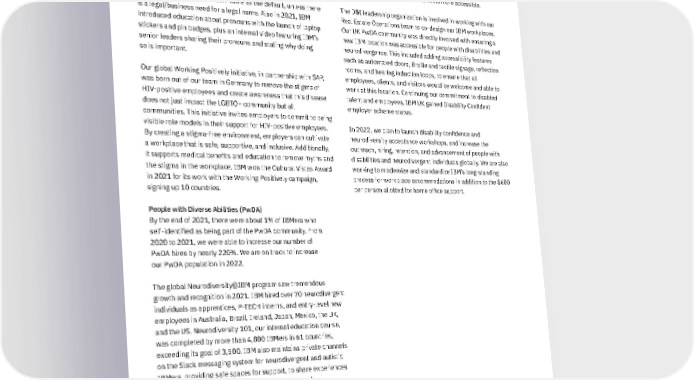 Throughout the year, we referenced the IBM white paper Designing AI Applications to Treat People with Disabilities Fairly , published December 2020, as a tool to work with all our vendors to implement changes to make our tools more accessible. The D&I leadership organization is involved in working with our Real Estate Operations team to co-design our IBM workplaces. Our UK PwDA community was directly involved with ensuring a new IBM location was accessible for people with disabilities and neurodivergence. This included adding accessibility features such as automated doors, Braille and tactile signage, reflection rooms, and hearing induction loops, to ensure that all employees, clients, and visitors would be welcome and able to work at this location. Continuing our commitment to disabled talent and employees, IBM UK gained Disability Confident employer scheme status. In 2022, we plan to launch disability confidence and neurodiversity acceptance workshops, and increase the outreach, hiring, retention, and advancement of people with disabilities and neurodivergent individuals globally. We are also working to modernize and standardize IBM’s long-standing process for workplace accommodations in addition to the $600 per person allotted for home office support. Since launching our gender transition support framework and corresponding white paper in 2017, IBM has continued to evolve its support of transgender employees. Not all trans and nonbinary employees are able to change their legal name, so IBM updated its internal systems in 2021 to offer IBMers the option to use their chosen name as the default, unless there is a legal/business need for a legal name. Also in 2021, IBM introduced education about pronouns with the launch of laptop stickers and pin badges, plus an internal video featuring IBM’s senior leaders sharing their pronouns and stating why doing so is important. Our global Working Positively initiative, in partnership with SAP, was born out of our team in Germany to remove the stigma of HIV-positive employees and create awareness that this disease does not just impact the LGBTQ+ community but all communities. This initiative invites employers to commit to being visible role models in their support for HIV-positive employees. By creating a stigma-free environment, employers can cultivate a workplace that is safe, supportive, and inclusive. Additionally, it supports medical benefits and education to remove myths and the stigma in the workplace. IBM won the Cultural Vistas Award in 2021 for its work with the Working Positively campaign, signing up 10 countries. People with Diverse Abilities (PwDA) By the end of 2021, there were about 1% of IBMers who self-identified as being part of the PwDA community. From 2020 to 2021, we were able to increase our number of PwDA hires by nearly 220%. We are on track to increase our PwDA population in 2022. The global Neurodiversity@IBM program saw tremendous growth and recognition in 2021. IBM hired over 70 neurodivergent individuals as apprentices, P-TECH interns, and entry-level new employees in Australia, Brazil, Ireland, Japan, Mexico, the UK, and the US. Neurodiversity 101, our internal education course, was completed by more than 4,800 IBMers in 61 countries, exceeding its goal of 3,500. IBM also maintains private channels on the Slack messaging system for neurodivergent and autistic IBMers, providing safe spaces for support, to share experiences and resources, and to ensure their voices are heard. IBM celebrated International Day of Persons with Disabilities with numerous learning opportunities around the world, including a live accessibility training session. In 2021, over 800 IBMers earned the Accessibility Advocate digital badge. Our goal for 2022 is for 2,022 more IBMers to earn this badge. 24 IBM 2021 ESG Report