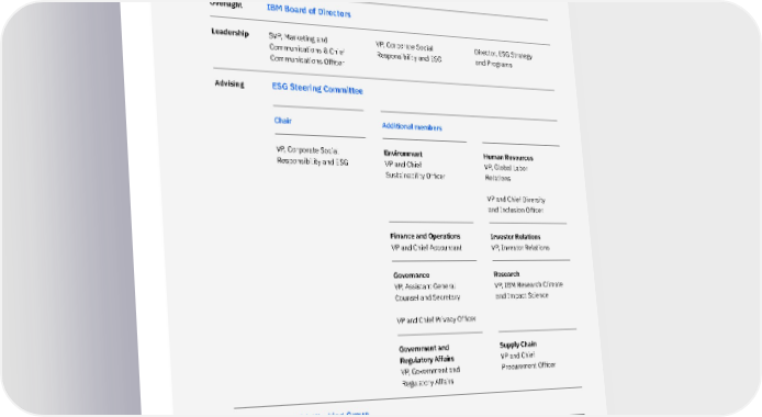IBM’s ESG strategy Environment VP and Chief Sustainability Officer VP, Corporate Social Responsibility and ESG VP, Corporate Social Responsibility and ESG Finance and Operations VP and Chief Accountant Human Resources VP, Global Labor Relations VP and Chief Diversity and Inclusion Officer Supply Chain VP and Chief Procurement Officer Research VP, IBM Research Climate and Impact Science Government and Regulatory Affairs VP, Government and Regulatory Affairs Investor Relations VP, Investor Relations Governance VP, Assistant General Counsel and Secretary VP and Chief Privacy Officer Additional members Chair Oversight IBM Board of Directors Leadership Advising Support ESG Steering Committee ESG Working Group SVP, Marketing and Communications & Chief Communications Officer Director, ESG Strategy and Programs 10 IBM 2021 ESG Report 10 IBM 2021 ESG Report