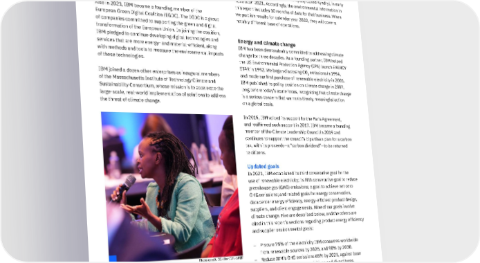 Spinoff of IBM’s managed infrastructure services business IBM completed the spinoff of its managed infrastructure services business, now a publicly traded company called Kyndryl, in early November 2021. Accordingly, the environmental information in this report includes 10 months of data for that business. When we publish results for calendar year 2022, they will cover a notably different base of operations. Energy and climate change IBM has been demonstrably committed to addressing climate change for three decades. As a founding partner, IBM helped the US Environmental Protection Agency (EPA) launch ENERGY STAR in 1992. We began disclosing CO 2 emissions in 1994, and made our first purchase of renewable electricity in 2001. IBM published its policy position on climate change in 2007, long before today’s acute focus, recognizing that climate change is a serious concern that warrants timely, meaningful action on a global basis. In 2015, IBM voiced its support for the Paris Agreement, and reaffirmed such support in 2017. IBM became a founding member of the Climate Leadership Council in 2019 and continues to support the council’s bipartisan plan for a carbon tax, with its proceeds—a “carbon dividend”—to be returned to citizens. Updated goals In 2021, IBM established its third consecutive goal for the use of renewable electricity; its fifth consecutive goal to reduce greenhouse gas (GHG) emissions; a goal to achieve net-zero GHG emissions; and related goals for energy conservation, data center energy efficiency, energy-efficient product design, suppliers, and client engagements. Nine of our goals involve climate change. Five are described below, and the others are cited in this report’s sections regarding product energy efficiency and supplier environmental goals: – Procure 75% of the electricity IBM consumes worldwide from renewable sources by 2025, and 90% by 2030. – Reduce IBM’s GHG emissions 65% by 2025, against base year 2010, adjusted for acquisitions and divestitures. – Reach net-zero GHG emissions by 2030, using feasible technologies to remove emissions in an amount which equals or exceeds IBM’s residual emissions. Aim for residual emissions of 350,000 metric tons of CO 2 equivalent or less by 2030. IBM joined the Climate Neutral Data Centre Pact in 2021. As a member, IBM will continue to increase energy efficiency, purchase additional renewable electricity, conserve water, and facilitate the reuse and repair of IT equipment at our data centers. Also in 2021, IBM became a founding member of the European Green Digital Coalition (EGDC). The EGDC is a group of companies committed to supporting the green and digital transformation of the European Union. In joining the coalition, IBM pledged to continue developing digital technologies and services that are more energy- and material-efficient, along with methods and tools to measure the environmental impacts of these technologies. IBM joined a dozen other enterprises as inaugural members of the Massachusetts Institute of Technology Climate and Sustainability Consortium, whose mission is to accelerate the large-scale, real-world implementation of solutions to address the threat of climate change. Charity Wayua of IBM Research Africa spoke at a UN Environment Assembly meeting on big data for the environment in March 2022. Photo credit: DSkilton/UN-SPBF 40 IBM 2021 ESG Report