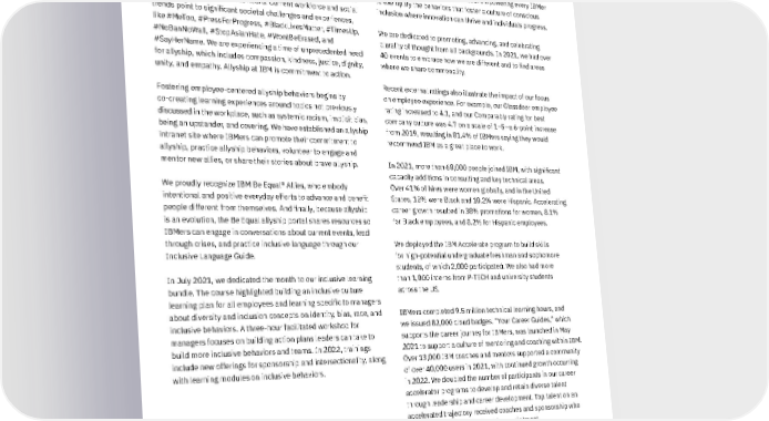 Employee experience IBM’s purpose is underpinned by a corporate culture driven to achieve growth for our clients, our company, and ourselves. The employee experience at IBM is about empowering every IBMer to exemplify the behaviors that foster a culture of conscious inclusion where innovation can thrive and individuals progress. We are dedicated to promoting, advancing, and celebrating plurality of thought from all backgrounds. In 2021, we had over 40 events to embrace how we are different and to find areas where we share commonality. Recent external ratings also illustrate the impact of our focus on employee experience. For example, our Glassdoor employee rating increased to 4.1, and our Comparably rating for best company culture was 4.7 on a scale of 1–5—a 6-point increase from 2019, resulting in 81.4% of IBMers saying they would recommend IBM as a great place to work. In 2021, more than 68,000 people joined IBM, with significant capacity additions in consulting and key technical areas. Over 41% of hires were women globally, and in the United States, 15% were Black and 10.2% were Hispanic. Accelerating career growth resulted in 38% promotions for women, 8.1% for Black employees, and 8.2% for Hispanic employees. We deployed the IBM Accelerate program to build skills for high-potential undergraduate freshman and sophomore students, of which 2,000 participated. We also had more than 1,000 interns from P-TECH and university students across the US. IBMers completed 9.5 million technical learning hours, and we issued 82,000 cloud badges. “Your Career Guides,” which supports the career journey for IBMers, was launched in May 2021 to support a culture of mentoring and coaching within IBM. Over 13,000 IBM coaches and mentors supported a community of over 40,000 users in 2021, with continued growth occurring in 2022. We doubled the number of participants in our career accelerator programs to develop and retain diverse talent through leadership and career development. Top talent on an accelerated trajectory received coaches and sponsorship who are in the pipeline for leadership appointment. Allyship Allyship means creating a psychologically safe and supportive workplace where IBMers can be their authentic selves. It requires a culture that fosters a sense of inclusion and belonging for everyone. Allyship includes the intentional action of others so every voice is respected and heard. Current workforce and social trends point to significant societal challenges and experiences, like #MeToo, #PressForProgress, #BlackLivesMatter, #TimesUp, #NoBanNoWall, #StopAsianHate, #WontBeErased, and #SayHerName. We are experiencing a time of unprecedented need for allyship, which includes compassion, kindness, justice, dignity, unity, and empathy. Allyship at IBM is commitment to action. Fostering employee-centered allyship behaviors begins by co-creating learning experiences around topics not previously discussed in the workplace, such as systemic racism, implicit bias, being an upstander, and covering. We have established an allyship intranet site where IBMers can promote their commitment to allyship, practice allyship behaviors, volunteer to engage and mentor new allies, or share their stories about brave allyship. We proudly recognize IBM Be Equal® Allies, who embody intentional and positive everyday efforts to advance and benefit people different from themselves. And finally, because allyship is an evolution, the Be Equal allyship portal shares resources so IBMers can engage in conversations about current events, lead through crises, and practice inclusive language through our Inclusive Language Guide. In July 2021, we dedicated the month to our inclusive learning bundle. The course highlighted building an inclusive culture learning plan for all employees and learning specific to managers about diversity and inclusion concepts on identity, bias, race, and inclusive behaviors. A three-hour facilitated workshop for managers focuses on building action plans leaders can take to build more inclusive behaviors and teams. In 2022, trainings include new offerings for sponsorship and intersectionality, along with learning modules on inclusive behaviors. 22 IBM 2021 ESG Report