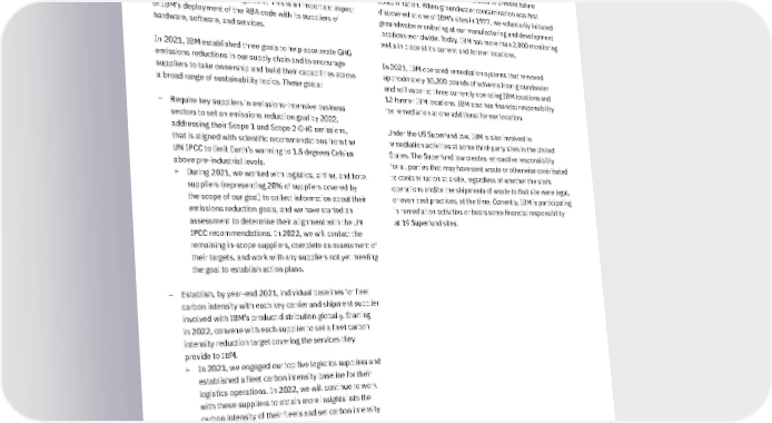 Supplier environmental goals Since 2010, IBM has required all first-tier suppliers to establish their own social and environmental management systems as well as set quantifiable goals and publicly disclose progress toward those goals in the areas of energy management, GHG emissions reduction, and waste management. This is an important aspect of IBM’s deployment of the RBA code with its suppliers of hardware, software, and services. In 2021, IBM established three goals to help accelerate GHG emissions reductions in our supply chain and to encourage suppliers to take ownership and build their capabilities across a broad range of sustainability topics. These goals: – Require key suppliers in emissions-intensive business sectors to set an emissions reduction goal by 2022, addressing their Scope 1 and Scope 2 GHG emissions, that is aligned with scientific recommendations from the UN IPCC to limit Earth’s warming to 1.5 degrees Celsius above pre-industrial levels. + During 2021, we worked with logistics, airline, and hotel suppliers (representing 28% of suppliers covered by the scope of our goal) to collect information about their emissions reduction goals, and we have started an assessment to determine their alignment with the UN IPCC recommendations. In 2022, we will contact the remaining in-scope suppliers, complete an assessment of their targets, and work with any suppliers not yet meeting the goal to establish action plans. – Establish, by year-end 2021, individual baselines for fleet carbon intensity with each key carrier and shipment supplier involved with IBM’s product distribution globally. Starting in 2022, convene with each supplier to set a fleet carbon intensity reduction target covering the services they provide to IBM. + In 2021, we engaged our top five logistics suppliers and established a fleet carbon intensity baseline for their logistics operations. In 2022, we will continue to work with these suppliers to obtain more insights into the carbon intensity of their fleets and set carbon intensity reduction goals. – Convene an annual Sustainability Leadership Symposium to recognize progress and achievement among suppliers in emissions-intensive business sectors across applicable areas of environmental stewardship. + Our first Supplier Sustainability Leadership Symposium is planned for the second half of 2022. Remediation At IBM, we take swift action to clean up any environmental contamination found at former and current sites, and we are committed to taking proactive measures to prevent future contamination. When groundwater contamination was first discovered at one of IBM’s sites in 1977, we voluntarily initiated groundwater monitoring at our manufacturing and development locations worldwide. Today, IBM has more than 2,000 monitoring wells in place at its current and former locations. In 2021, IBM operated remediation systems that removed approximately 10,200 pounds of solvents from groundwater and soil vapor at three currently operating IBM locations and 12 former IBM locations. IBM also has financial responsibility for remediation at one additional former location. Under the US Superfund law, IBM is also involved in remediation activities at some third-party sites in the United States. The Superfund law creates retroactive responsibility for all parties that may have sent waste or otherwise contributed to contamination at a site, regardless of whether the site’s operations and/or the shipments of waste to that site were legal, or even best practices, at the time. Currently, IBM is participating in remediation activities or bears some financial responsibility at 19 Superfund sites. 47 IBM 2021 ESG Report