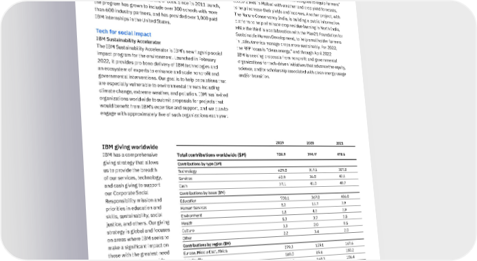 P-TECH P-TECH is a global education and career readiness model that combines public high school and no-cost community college, along with mentoring and paid workplace experiences from industry partners, equipping graduates to start a new collar career, continue their education, or both. Since its 2011 launch, the program has grown to include over 300 schools with more than 600 industry partners, and has provided over 1,000 paid IBM internships in the United States. Tech for social impact IBM Sustainability Accelerator The IBM Sustainability Accelerator is IBM’s new flagship social impact program for the environment. Launched in February 2022, it provides pro bono delivery of IBM technologies and an ecosystem of experts to enhance and scale nonprofit and governmental interventions. Our goal is to help populations that are especially vulnerable to environmental threats including climate change, extreme weather, and pollution. IBM has invited organizations worldwide to submit proposals for projects that would benefit from IBM’s expertise and support, and we plan to engage with approximately five of such organizations each year. As part of a pilot launch in 2021, IBM supported projects from three organizations, all focused on sustainable agriculture. One is a collaboration with Heifer International to develop scalable, affordable digital solutions designed to equip farmers’ cooperatives in Malawi with weather and crop yield forecasts, to help increase their yields and incomes. Another project, with The Nature Conservancy India, is building a public information platform to help eliminate crop residue burning in North India, while the third is a collaboration with the Plan21 Foundation for Sustainable Human Development, to help smallholder farmers in Latin America manage crops more sustainably. For 2022, the RFP focus is “clean energy,” and through April 2022 IBM is seeking proposals from nonprofit and governmental organizations for tech-driven initiatives that advance the equity, science, and/or scholarship associated with clean energy usage and/or transition. 2019 2020 2021 Total contributions worldwide ($M) 728.9 394.9 † 470.6 Contributions by type ($M) Technology 629.8 317.1 387.8 Services 62.0 36.8 42.1 Cash 37.1 41.0 40.7 Contributions by issue ($M) Education 708.1 367.8 456.8 Human Services 8.2 13.7 3.9 Environment 1.8 4.3 3.9 Health 5.3 3.7 3.5 Culture 3.3 2.0 0.5 Other 2.2 3.4 2.0 Contributions by region ($M) Europe, Middle East, Africa 279.3 129.1 167.6 Asia Pacific 160.0 69.6 150.2 North America 235.3 168.3 106.4 Latin America 54.3 27.9 46.4 † Reflects year-to-year decrease due to COVID-19 pandemic of approximately $334 million in IBM Academic Initiative software contributions reported in Education and Technology, and across all regions. IBM giving worldwide IBM has a comprehensive giving strategy that allows us to provide the breadth of our services, technology, and cash giving to support our Corporate Social Responsibility mission and priorities in education and skills, sustainability, social justice, and others. Our giving strategy is global and focuses on areas where IBM seeks to make a significant impact on those with the greatest need for the support we provide. 32 IBM 2021 ESG Report
