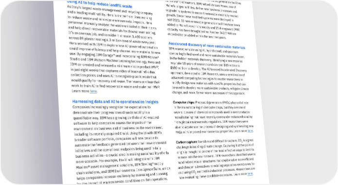 Using technology and expertise to help clients and the world IBM continues to apply technologies and expertise to help clients become more environmentally sustainable and accelerate solutions to address environmental challenges. Using AI to help reduce landfill waste As Italy’s largest waste management and recycling company and a leading multi-utility, Hera is on the front lines working to reduce waste and minimize environmental impacts. Hera personnel manually analyze the waste unloaded at their plants and help direct recoverable materials for downstream sorting. It’s an onerous job, and consider it at scale: 1,400 spotters across 89 plants treating 6.3 million tons of waste every year. Hera worked with IBM to explore how AI-powered automation could improve efficiency and help channel more material to new use. By engaging IBM Garage™ and incorporating IBM Watson® Studio and IBM Watson Machine Learning technology, Hera and IBM co-created and released a minimum viable product (MVP) in just eight weeks that captures video of trash at individual collection points and uses AI to recognize plastic waste that would qualify for recovery and reuse. The teams continue their work to train AI to find recoverable waste and scale their MVP. Learn more here . Harnessing data and AI to operationalize insights Companies increasingly recognize the expectations to demonstrate their progress toward sustainability in a quantifiable way. IBM has a growing portfolio of AI-enabled software to help companies assess the impacts of the environment on business and of business on the environment, including its recently acquired Envizi. Using Envizi with IBM’s broader software portfolio, companies will now be able to automate the feedback generated between their environmental initiatives and the operational endpoints being used in daily business activities—a crucial step in making sustainability efforts more scalable. For example, Envizi will integrate with IBM Maximo® asset management solutions, IBM Sterling® supply chain solutions, and IBM Environmental Intelligence Suite, which helps companies increase resiliency by assessing and planning for the impact of environmental conditions on their operations. Learn more here . Supporting renewable electricity market growth The state of Maine is encouraging greater use of renewable resources. This has resulted in significant changes to the electric distribution business to connect distributed generation facilities with electric consumers. IBM helped Versant Power, one of Maine’s largest utilities, define new business processes and upgrade its systems to support renewable electricity market growth. Since these modified systems were deployed in mid-2021, 11 new renewable generation facilities have been added to Maine’s electricity supply and 17.4 megawatt (MW) capacity has been brought online. Another 342.7 MW are expected to be added within the next two years. Accelerated discovery of more sustainable materials IBM researchers are using AI, hybrid cloud, and quantum computing to find novel and more sustainable materials faster. In the field of materials discovery, identifying a new material may take 10 years of research and can cost $10 million to $100 million to develop. The AI-boosted Accelerated Discovery approach, developed at IBM Research, uses a combination of advanced computing technologies to enable researchers to rapidly design new materials with specific properties that can be used to develop more sustainable products, mitigate climate change, and more. Some recent successes of this approach: Computer chips: Photoacid generators (PAGs) play a vital role in the manufacturing of computer chips, but they are one of several classes of chemical compounds used in semiconductor manufacturing that have recently come under enhanced scrutiny from global environmental regulators. IBM researchers were able to accelerate the process of designing and synthesizing new PAGs with improved environmental properties . Learn more here . Carbon capture: Invisible and difficult to capture, CO 2 is a great challenge in tackling climate change. Capturing it at the point of origin is thought to be one of the most effective ways to limit its release into the environment. IBM researchers identified several hundred molecular structures that could enable more efficient and cheaper alternatives to existing separation membranes for capturing CO 2 emitted in industrial processes. Researchers are now evaluating these candidate molecules. Learn more here . 48 IBM 2021 ESG Report