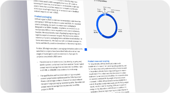 Nonessential, single-use plastics in cafeterias IBM set a goal in 2021 to further our efforts to eliminate nonessential, single-use plastic items (e.g., cups, straws, cutlery, plates, carry bags, and food containers) from IBM-managed cafeteria operations globally by 2025. Our focus in 2021 was to engage with our largest cafeteria vendor to identify single-use plastic items used in IBM-managed cafeterias at 37 locations spanning 17 countries. Alternatives for nonessential, single-use plastic items that are either reusable or compatible with each site’s local recycling/composting infrastructure were identified and will begin to roll out in 2022. Product packaging IBM set a goal in 2021 to eliminate nonessential plastic from the packaging of IBM logo hardware by year-end 2024. For essential plastic packaging, our goal is to ensure such packaging is designed to be 100% reusable, recyclable, or compostable, or incorporates 30% or more recycled content where technically feasible. We established a team of packaging engineering and logistics experts to execute the goal. The team completed an inventory of plastic packaging items and determined whether the items were essential. We have started to eliminate nonessential items and identify possible alternatives for the remaining items. To date, 18 single-use plastic packaging elimination and material substitution projects have been identified and are at various stages of investigation and implementation. Two specific projects completed in 2021 were: – The elimination of stretch wrap (low-density polyethylene) used to protect parts/machines from weather. The estimated annual material savings from implementation of this project is 1.9 MT, or 238,000 linear meters of stretch wrap. – The qualification and implementation of high-recycled- content polyethylene cushions used for IBM z Systems,® Power, and storage products. These efforts have reduced the use of virgin packaging materials by 60%. The estimated annual material savings from implementation of this project is 90 MT. 2021 product end-of-life processing methods Product reuse and recycling For many decades, IBM has developed products with consideration for ease of their servicing and upgradability, and for the reuse, recyclability and recoverability of materials used in the products. We also have a long-standing goal to reuse or recycle end-of-life products such that the amount of product waste sent by our operations to landfills or for incineration does not exceed a combined 3% (by weight) of the total amount processed. In 2021, IBM processed more than 18,000 MT of end-of-life products and product waste, with 97.7% (by weight) reused, resold, or sent for recycling, 2.0% sent to waste-to- energy for final disposition, and 0.3% sent to landfills or for incineration. Since we began reporting on product disposal in 1995, IBM has processed 1.12 million MT (2.46 billion pounds) of products and product waste worldwide. Landfill or incineration 0.3% Resold 35.7% Recycled 60.5% Waste-to-energy 2% Reused 1.5% 46 IBM 2021 ESG Report