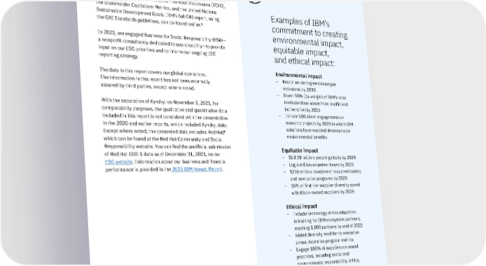 Environmental impact – Reach net-zero greenhouse gas emissions by 2030 – Divert 90% (by weight) of IBM’s total nonhazardous waste from landfill and incineration by 2025 – Initiate 100 client engagements or research projects by 2025 in which IBM solutions have enabled demonstrable environmental benefits Equitable impact – Skill 30 million people globally by 2030 – Log 4 million volunteer hours by 2025 – $250 million investment in apprenticeship and new collar programs by 2025 – 15% of first-tier supplier diversity spend with Black-owned suppliers by 2025 Ethical impact – Include technology ethics education in training for IBM ecosystem partners, reaching 1,000 partners by end of 2022 – Added diversity modifier to executive annual incentive program metrics – Engage 100% of suppliers on sound practices, including social and environmental responsibility, ethics, and risk planning This report covers our progress and performance in 2021 and some notable activities during the first quarter of 2022. In selecting content for inclusion, we were inspired by frameworks and initiatives such as the Global Reporting Initiative (GRI) Standards, the Sustainability Accounting Standards Board, the Task Force on Climate-Related Financial Disclosures (TCFD), the Stakeholder Capitalism Metrics, and the United Nations Sustainable Development Goals. IBM’s full GRI report, using the GRI Standards guidelines, can be found online. 1 In 2021, we engaged Business for Social Responsibility (BSR)— a nonprofit consultancy dedicated to sustainability—to provide input on our ESG priorities and to inform our ongoing ESG reporting strategy. The data in this report covers our global operations. The information in this report has not been externally assured by third parties, except where noted. With the separation of Kyndryl on November 3, 2021, for comparability purposes, the qualitative and quantitative data included in this report is not consistent with the presentation in the 2020 and earlier reports, which included Kyndryl data. Except where noted, the presented data excludes Red Hat,® which can be found at the Red Hat Community and Social Responsibility website. You can find the unofficial submission of Red Hat EEO-1 data as of December 31, 2021, on our ESG website . Information about our business and financial performance is provided in the 2021 IBM Annual Report . Examples of IBM’s commitment to creating environmental impact, equitable impact, and ethical impact: 1 Each of the frameworks and initiatives referenced above discloses policies and material metrics related to ESG topics. However, the concept of materiality is defined differently under these reporting frameworks, and we do not attempt to formally reconcile the divergent uses of the term “materiality” by these frameworks. 8 IBM 2021 ESG Report 8 IBM 2021 ESG Report