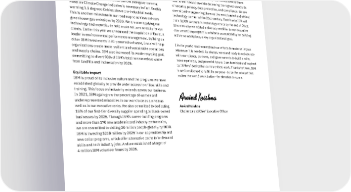 Ethical impact As a responsible steward of technology, IBM is focused on developing policies and practices that prioritize ethics, trust, transparency, and accountability. Our clients and partners must drive innovation while delivering the highest standards of security, privacy, data protection, and compliance. We are committed to supporting them as the most trusted and ethical technology partner of the 21st century. That is why IBM will train 1,000 partners in technology ethics by the end of 2022. It is also why we added a diversity modifier to our executive compensation program to reinforce accountability for building a diverse workplace, a key organizational goal. I invite you to read more about our efforts to make an impact wherever it is needed. As always, we stand ready to collaborate with our clients, partners, and governments to build a safer, more equitable, and peaceful future. I am humbled and inspired by IBMers’ dedication to this critical work. Thanks to them, IBM is well positioned to fulfill its purpose—to be the catalyst that makes the world work better—for decades to come. Arvind Krishna Chairman and Chief Executive Officer Environmental impact In 2021, we continued IBM’s long tradition of conserving natural resources and reducing pollution, using renewable energy, and developing solutions to climate change. IBM set a new 2025 greenhouse gas emissions reduction goal that exceeds the rate of reduction that the UN Intergovernmental Panel on Climate Change indicates is necessary to limit Earth’s warming 1.5 degrees Celsius above pre-industrial levels. This is another milestone in our roadmap to achieve net-zero greenhouse gas emissions by 2030. We are also applying our technology and expertise to help make net zero a reality for our clients. Earlier this year we announced the acquisition of Envizi, a leader in environmental performance management. Building on other IBM investments in AI-powered software, Envizi will help organizations create more resilient and sustainable operations and supply chains. IBM also increased its waste recycling goal, committing to divert 90% of IBM’s total nonhazardous waste from landfills and incineration by 2025. Equitable impact IBM is proud of its inclusive culture and the programs we have established globally to provide wider access to critical skills and training. This focus on inclusivity extends across our business. In 2021, IBM again grew the percentage of women and underrepresented minorities in our workforce as a whole as well as in our executive ranks. We also committed to dedicating 15% of our first-tier diversity supplier spending to Black-owned businesses by 2025. Through IBM’s career-building programs and more than 170 new academic and industry partnerships, we are committed to skilling 30 million people globally by 2030. IBM is investing $250 million by 2025 in our apprenticeship and new collar programs, which offer alternative paths to in-demand skills and tech industry jobs. And we established a target of 4 million IBM volunteer hours by 2025. 5 IBM 2021 ESG Report 5 IBM 2021 ESG Report