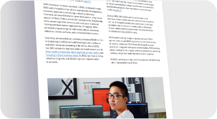 Hispanic US Hispanic representation increased to 6.8%, and 10.2% among new hires in 2021. Attrition remained flat overall; however, in our management, technical, and executive roles, our attrition declined. Our focus is to continue to close the gap across all representation categories and focus on acceleration and retention programs. See more detail on our three-year trends on page 27 . In June 2021, IBM reinforced its commitment to the American Dream and Promise Act and maintains its position that the US Congress should pass a permanent, bipartisan legislative solution that will provide a path to citizenship for work-authorized employees under the Deferred Action for Childhood Arrivals (DACA) policy. We focused on hiring through programs such as P-TECH, apprenticeships, and IBM Accelerate to attract talent across all careers, including in STEM fields. We focused on career accelerator programs for Hispanic women leaders, STAR technical development pipeline program, executive sponsorship, mentoring matters, and partner leadership development programs. In 2022, our focus is hiring, retention programs and developing talent representation at all levels. Black US Black representation rose to 7.7% in 2021 and 15% among new hires. Our goal is to continue to close the gap across all representation categories to better reflect the communities in which IBMers live and work, with a focus on retention programs. See more detail on our three-year trends on page 27 . IBM’s Emb(race) initiative, launched in 2020, continued through 2021 and is focused on four pillars: representation/transparency, economic opportunity, technology, and policy advocacy. Internally, we launched several career development programs in support of Black IBMers, which offer avenues to build leadership skills, secure high-level mentors, and participate in external training and development opportunities. Throughout 2021, we hosted programming that addressed cultural awareness, education, mental wellness, and professional development. Externally, we exceeded our previously announced $100 million in-kind giving to HBCUs with additional equipment, software, and other resources amounting to $6 million. Also in 2021, the IBM Institute for Business Value published several reports: Black leaders in business , Nurturing Black women leaders , and Investing in Black technical talent . In 2022, our focus is hiring, retention programs, and developing talent representation at all levels. 26 IBM 2021 ESG Report