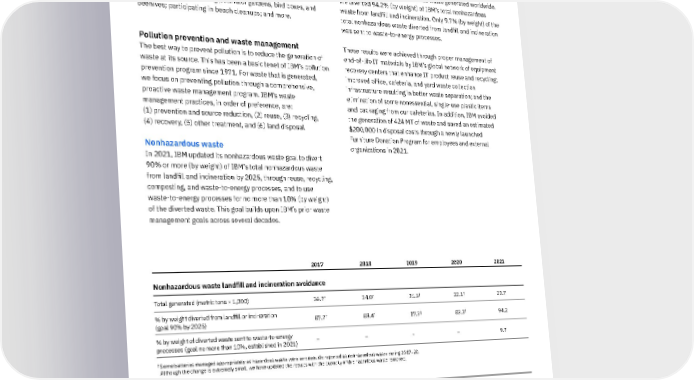Local EcoTeams—employees who volunteer to participate in a variety of local environmental initiatives—lead projects to support ecosystem diversity and protection. IBM’s 28 EcoTeams, which span 70 IBM locations across 21 countries, completed approximately 180 activities in 2021: holding learning events; planting trees; maintaining pollinator gardens, bird boxes, and beehives; participating in beach cleanups; and more. Pollution prevention and waste management The best way to prevent pollution is to reduce the generation of waste at its source. This has been a basic tenet of IBM’s pollution prevention program since 1971. For waste that is generated, we focus on preventing pollution through a comprehensive, proactive waste management program. IBM’s waste management practices, in order of preference, are: (1) prevention and source reduction, (2) reuse, (3) recycling, (4) recovery, (5) other treatment, and (6) land disposal. Nonhazardous waste In 2021, IBM updated its nonhazardous waste goal to divert 90% or more (by weight) of IBM’s total nonhazardous waste from landfill and incineration by 2025, through reuse, recycling, composting, and waste-to-energy processes, and to use waste-to-energy processes for no more than 10% (by weight) of the diverted waste. This goal builds upon IBM’s prior waste management goals across several decades. In 2021, our operations generated 20,700 MT of nonhazardous waste worldwide, including IBM-owned nonhazardous end-of- life machines, parts, and materials, which accounted for 48% by weight of IBM’s total nonhazardous waste generated worldwide. We diverted 94.2% (by weight) of IBM’s total nonhazardous waste from landfill and incineration. Only 9.7% (by weight) of the total nonhazardous waste diverted from landfill and incineration was sent to waste-to-energy processes. These results were achieved through proper management of end-of-life IT materials by IBM’s global network of equipment recovery centers that enhance IT product reuse and recycling; improved office, cafeteria, and yard waste collection infrastructure resulting in better waste separation; and the elimination of some nonessential, single-use plastic items and packaging from our cafeterias. In addition, IBM avoided the generation of 424 MT of waste and saved an estimated $200,000 in disposal costs through a newly launched Furniture Donation Program for employees and external organizations in 2021. 2017 2018 2019 2020 2021 Nonhazardous waste landfill and incineration avoidance Total generated (metric tons × 1,000) 36.7 † 34.0 † 31.5 † 22.1 † 20.7 % by weight diverted from landfill or incineration (goal 90% by 2025) 87.7 † 89.4 † 87.3 † 83.3 † 94.2 % by weight of diverted waste sent to waste-to-energy processes (goal no more than 10%, established in 2021) – – – – 9.7 † Some batteries managed appropriately as hazardous waste were erroneously reported as nonhazardous waste during 2017–20. Although the change is extremely small, we have updated the results with the quantity of this hazardous waste removed. Product reuse and recycling % by weight of total IT product waste sent by IBM’s product end-of-life operations to landfill or incineration for treatment (goal not to exceed a combined 3% by weight) 0.7 0.7 0.8 0.5 0.3 45 IBM 2021 ESG Report