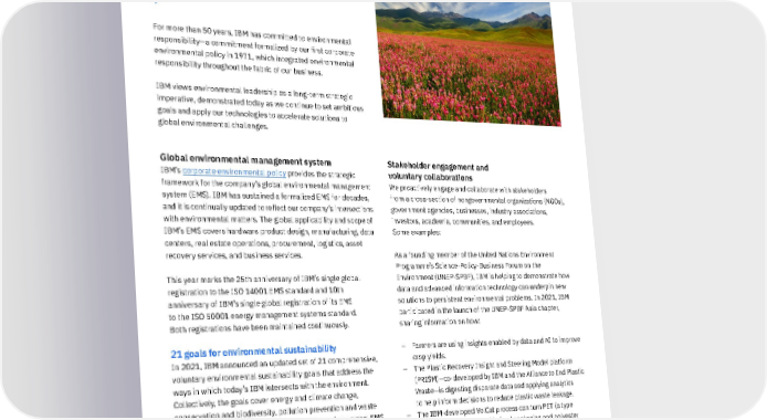 Stakeholder engagement and voluntary collaborations We proactively engage and collaborate with stakeholders from a cross-section of nongovernmental organizations (NGOs), government agencies, businesses, industry associations, investors, academia, communities, and employees. Some examples: As a founding member of the United Nations Environment Programme’s Science-Policy-Business Forum on the Environment (UNEP-SPBF), IBM is helping to demonstrate how data and advanced information technology can underpin new solutions to persistent environmental problems. In 2021, IBM participated in the launch of the UNEP-SPBF Asia chapter, sharing information on how: – Farmers are using insights enabled by data and AI to improve crop yields. – The Plastic Recovery Insight and Steering Model platform (PRISM)—co-developed by IBM and the Alliance to End Plastic Waste—is digesting disparate data and applying analytics to help inform decisions to reduce plastic waste leakage. – The IBM-developed VolCat process can turn PET (a type of plastic commonly used in food packaging and polyester clothing) into a renewable resource. – IBM is identifying new catalysts that enable efficiency improvements in the conversion of carbon dioxide (CO 2 ) to new materials such as aliphatic polycarbonates. Environmental impact ↗ For more than 50 years, IBM has committed to environmental responsibility—a commitment formalized by our first corporate environmental policy in 1971, which integrated environmental responsibility throughout the fabric of our business. IBM views environmental leadership as a long-term strategic imperative, demonstrated today as we continue to set ambitious goals and apply our technologies to accelerate solutions to global environmental challenges. Global environmental management system IBM’s corporate environmental policy provides the strategic framework for the company’s global environmental management system (EMS). IBM has sustained a formalized EMS for decades, and it is continually updated to reflect our company’s intersections with environmental matters. The global applicability and scope of IBM’s EMS covers hardware product design, manufacturing, data centers, real estate operations, procurement, logistics, asset recovery services, and business services. This year marks the 25th anniversary of IBM’s single global registration to the ISO 14001 EMS standard and 10th anniversary of IBM’s single global registration of its EMS to the ISO 50001 energy management systems standard. Both registrations have been maintained continuously. 21 goals for environmental sustainability In 2021, IBM announced an updated set of 21 comprehensive, voluntary environmental sustainability goals that address the ways in which today’s IBM intersects with the environment. Collectively, the goals cover energy and climate change, conservation and biodiversity, pollution prevention and waste management, supply chain and value chain, and our global EMS. We establish near-term goals that are transparent and authentic to drive real progress and accountability. We work hard to avoid opaque representations of achievement. For detailed information about each of these goals, please see “Driving progress with 21 goals for environmental sustainability.” 39 IBM 2021 ESG Report