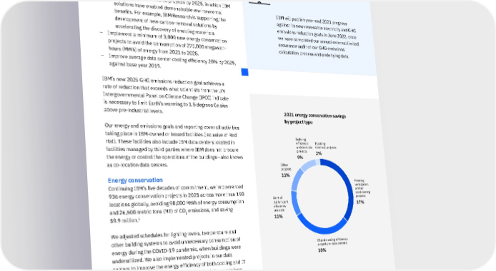 IBM will publish year-end 2021 progress against its new renewable electricity and GHG emissions reduction goals in June 2022, once we have completed our annual external limited assurance audit of our GHG emissions calculation process and underlying data. + With reference to the voluntary Greenhouse Gas Protocol, this addresses Scope 1, Scope 2, and Scope 3 emissions associated with electricity consumption at third-party co-location data centers. + IBM has also committed to initiating 100 client engagements or research projects by 2025, in which IBM solutions have enabled demonstrable environmental benefits. For example, IBM Research is supporting the development of new carbon-removal solutions by accelerating the discovery of enabling materials. – Implement a minimum of 3,000 new energy conservation projects to avoid the consumption of 275,000 megawatt- hours (MWh) of energy from 2021 to 2025. – Improve average data center cooling efficiency 20% by 2025, against base year 2019. IBM’s new 2025 GHG emissions reduction goal achieves a rate of reduction that exceeds what scientists from the UN Intergovernmental Panel on Climate Change (IPCC) indicate is necessary to limit Earth’s warming to 1.5 degrees Celsius above pre-industrial levels. Our energy and emissions goals and reporting cover all activities taking place in IBM-owned or leased facilities (inclusive of Red Hat). These facilities also include IBM data centers located in facilities managed by third parties where IBM does not procure the energy or control the operations of the buildings—also known as co-location data centers. Energy conservation Continuing IBM’s five decades of commitment, we implemented 936 energy conservation projects in 2021 across more than 190 locations globally, avoiding 90,000 MWh of energy consumption and 26,500 metric tons (MT) of CO 2 emissions, and saving $9.9 million. 1 We adjusted schedules for lighting levels, temperature and other building systems to avoid unnecessary consumption of energy during the COVID-19 pandemic, when buildings were underutilized. We also implemented projects in our data centers to improve the energy efficiency of both cooling and IT equipment, retrofitted lighting, and improved the operational efficiency of our building infrastructure. 1 In measuring performance against IBM’s energy conservation goal, we only include the first year’s savings from projects. Accordingly, IBM’s total energy savings and CO 2 emissions avoidance from these projects are greater than this simple summation of the annual results. We do not include reductions in energy consumption resulting from downsizings, the sale of operations or cost-avoidance actions, such as fuel switching and off-peak load shifting, in our energy conservation results. 2021 energy conservation savings by project type Building controls projects 2% IT and cooling efficiency projects in data centers 30% Heating, ventillation, and air conditioning projects 37% Lighting efficiency and controls projects 9% Other projects 11% Central utility plant efficiency projects 11% 41 IBM 2021 ESG Report