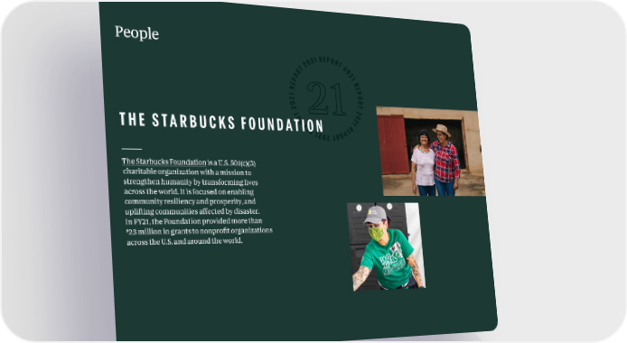 People 021 REPORT 2 T 2 02 OR 1 R EP E 1 R PO 20 TR 2T 02 RO 12 PER PER THE STARBUCKS FOUNDATION 12 02 T RO The Starbucks Foundation is a U.S. 501(c)(3) charitable organization with a mission to strengthen humanity by transforming lives across the world. It is focused on enabling community resiliency and prosperity, and uplifting communities affected by disaster. In FY21, the Foundation provided more than $ 23 million in grants to nonprofit organizations across the U.S. and around the world.