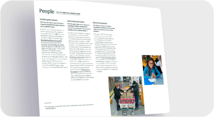 People THE STARBUCKS FOUNDATION Youth Equity Grants International Grants Disaster Response $ $ FY21 Results: More than 4 million FY21 Results: More than 40 grants FY21 Results: Nearly 4 million $ in grants awarded to organizations totaling 8 million awarded to awarded to promote resilience and serving BIPOC youth. impact communities that we serve uplift communities impacted by 18 disaster.18 In 2020, The Starbucks Foundation outside of the United States. committed to invest $ 5 million in The Starbucks Foundation supports Throughout FY21, The Starbucks nonprofits that serve BIPOC youth. communities around the world, Foundation continued to uplift In FY21, The Starbucks Foundation including in close partnership with communities affected by disaster $ finalized its grant recipients: Big our Starbucks partners and business by investing nearly 4 million Brothers Big Sisters of America, partners in local markets. In 2018, in preparedness, response and Boys & Girls Clubs of America, The Starbucks Foundation committed resilience programs around the world, City Year, Covenant House, Junior to invest in social impact programs including to support communities Achievement USA, MENTOR, Public in China and in FY21, achieved the disproportionately impacted by the $ Allies and YWCA USA. These grants milestone of 12 million in grants to increased frequency and intensity will support diversity, equity China nonprofit organizations. For of disasters due to climate change. and inclusion initiatives, youth example, the Foundation provided In addition to national support of mentorship and leadership and life a grant to the China Foundation the American Red Cross and global skills for youth through national- and for Poverty Alleviation to promote support of World Central Kitchen’s local-level programs in communities sustainable livelihoods for farmers chef relief efforts, the Foundation across the United States. As of in Yunnan through vocational provided quick support to impacted January 2022, programs supported training and expansion of economic communities, from Hurricane Eta by the Foundation’s grants have opportunities. In FY21, The Starbucks and the Texas winter storms to the impacted more than 100,000 youth. Foundation also expanded its Miami building collapse and volcano partnership with Planet Water eruption in the Democratic Republic Foundation, engaging Starbucks of Congo. partners as volunteers to provide clean water access and hygiene education programs to communities in seven different countries. 18 The geographic scope of this data point includes all company-owned and operated markets globally.