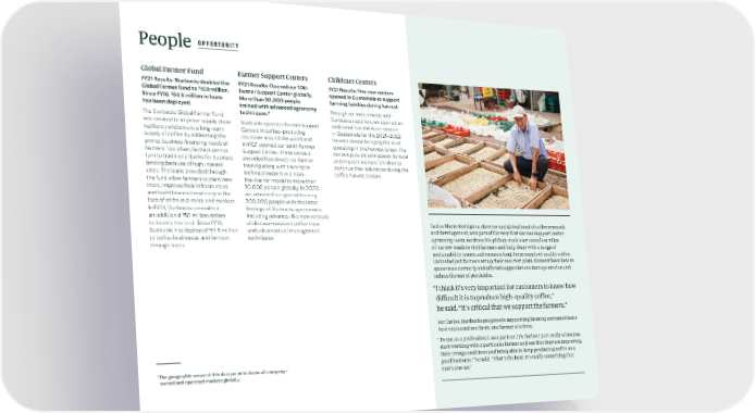 People OPPORTUNITY Global Farmer Fund Farmer Support Centers Childcare Centers FY21 Results: Starbucks doubled the FY21 Results: Opened our 10th FY21 Results: Five new centers $ Global Farmer Fund to 100 million. Farmer Support Center globally. opened in Guatemala to support $ More than 30,000 people farming families during harvest. Since FY18, 54.8 million in loans has been deployed. trained with advanced agronomy Through co-investments with The Starbucks Global Farmer Fund techniques.5 Starbucks suppliers, we opened an was created to improve supply chain Starbucks operates Farmer Support additional five childcare centers resiliency and ensure a long-term Centers in coffee-producing in Guatemala for the 2021-2022 supply of coffee by addressing the countries around the world and harvest season bringing the total unmet business financing needs of in FY21 opened our tenth Farmer operating in this harvest to ten. The farmers. Too often, farmers cannot Support Center. These centers centers provide safe spaces for local turn to traditional banks for business provided free direct-to-farmer and migrant workers’ children to lending because of high interest training along with training to continue their education during the rates. The loans provided through technical experts in a train- coffee harvest season. the fund allow farmers to plant new the-trainer model to more than trees, improve their infrastructure 30,000 people globally. In 2020, and build financial resiliency in the we achieved our goal of training face of shifts in climate and markets. 200,000 people with the latest In FY21, Starbucks committed findings of Starbucks agronomists $ an additional 50 million dollars including advances like new varietals to double the fund. Since FY18, of disease-resistant coffee trees Carlos Mario Rodriguez, director and global head of coffee research $ and advanced soil management Starbucks has deployed 54.8 million and development, was part of the very first Farmer Support Center to coffee businesses and farmers techniques. agronomy team. He drove his pickup truck over countless miles through loans. of narrow roads to visit farmers and help them with a range of sustainability issues and ensure a long-term supply of quality coffee. Carlos helped farmers set up their own test plots, showed them how to space trees correctly and offered suggestions to manage erosion and reduce the use of pesticides. “I think it’s very important for customers to know how difficult it is to produce high-quality coffee,” he said. “It’s critical that we support the farmers.” For Carlos, Starbucks progress in supporting farming communities is best measured one farm, one farmer at a time. “To me, as a professional, as a partner, it’s the best part really when you start working with a particular farmer and see that they are improving their living conditions and being able to keep producing coffee as a 5 good business,” he said. “That’s the best. It’s really something that The geographic scope of this data point includes all company- owned and operated markets globally. motivates us.”