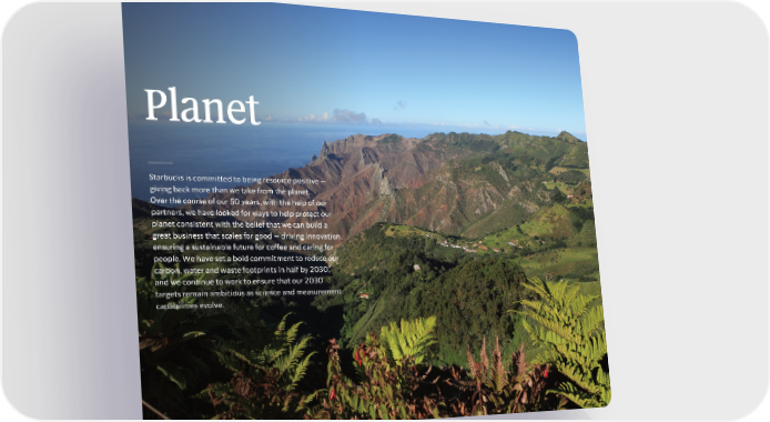 Planet Starbucks is committed to being resource positive — giving back more than we take from the planet. Over the course of our 50 years, with the help of our partners, we have looked for ways to help protect our planet consistent with the belief that we can build a great business that scales for good — driving innovation, ensuring a sustainable future for coffee and caring for people. We have set a bold commitment to reduce our carbon, water and waste footprints in half by 2030, and we continue to work to ensure that our 2030 targets remain ambitious as science and measurement capabilities evolve.