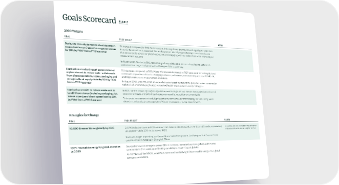 Goals Scorecard PLANET 2030 Targets GOAL FY21 RESULT NOTES Starbucks commits to reduce absolute scope 1, 1% increase compared to FY19. An increase at this stage in our journey towards significant reductions scope 2 and scope 3 greenhouse gas emissions in our GHG emissions is expected. We are focused on identifying and testing innovative solutions by 50% by FY30 from a FY19 base year that we can scale across our global operations and engaging with our value chain while improving our measurement systems. In March 2021, Starbucks GHG reduction goal was validated as science-based by the SBTi, which confirmed our target is aligned with a 1.5 degree Celsius pathway. Starbucks commits through conservation or 11% decrease compared to FY19. Water withdrawals decreased in FY21 because of shifts in agricultural replenishment to reduce water withdrawals commodities purchased due to changing customer preferences, continued impacts from COVID-19, from direct operations, stores, packaging and and improvements to measurement processes. our agricultural supply chain by 50% by FY30 In August 2021, we announced an expanded water target increasing the projected water conserved or from a FY19 base year replenished and catalyzing holistic watershed health improvements in high risk basins. Starbucks commits to reduce waste sent to In FY21, we are reporting progress against our waste target as two metrics: Starbucks diverted 32% of landfill from stores (including packaging that operational waste and 24% of packaging was reusable, recyclable or compostable. leaves stores) and direct operations by 50% To improve measurement and align to industry standards, our methodology for calculating waste by FY30 from a FY19 base year diversion and packaging was updated. We are reviewing our target going forward. Strategies for Change GOAL FY21 RESULT NOTES 10,000 Greener Stores globally by 2025 2,779 Starbucks stores in FY21 were certified Greener Stores mainly in the U.S. and Canada, representing SCS Global Services completed the verification an approximately 20% increase over FY20. of Starbucks Greener Stores program for FY21. Starbucks began expanding our Green Stores framework globally. Certifying our first Greener Store outside of North America in Shanghai, China. 100% renewable energy for global operation Sourced renewable energy to power 66% of company-operated locations globally with market by 2020 constraints in China and Japan limiting our ability to meet this goal globally. As members of the RE100, we remain committed to reaching 100% renewable energy in our global company operations.