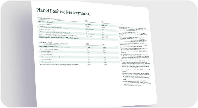 Planet Positive Performance ( ) WATER WITHDRAWALS megaliters FY19 FY21 Total water withdrawal 4,306,370 3,845,353 18 Total GHG emissions from fluid dairy purchases is inclusive of fluid 9,20,21 dairy categorized in scope 3 category 1 and category 14, and include Direct operations 22,996 24,177 22 estimated LUC associated with these purchases. Percent water withdrawn from high-risk basins Not calculated 32% 19 Total GHG emissions from gree coffee purchases is inclusive of 20 Indirect: licensed stores 9,737 13,271 estimated LUC associated with these purchases included in scope 22 3 category 1. Percent water withdrawn from high-risk basins Not calculated 42% 20 23 Water withdrawal from stores includes both primary and Indirect: packaging and agricultural commodities purchased 4,273,638 3,807,905 estimated data. Where primary data is not available, water Percent reduction of total water withdrawal from FY19 baseline 11% withdrawal is estimated by applying an average water withdrawal factor derived from U.S. and Canada company-owned stores. 21 Starbucks withdraws water strictly from local water utilities or 24 similar relevant entities, and as such all of our water withdrawals ( ) OPERATIONAL WASTE thousand metric tons FY19 FY21 are categorized as sourced from third-party water. 22 Total weight of non-hazardous operational waste 1,184 1,183 High risk basins refers to water withdrawals from facilities located in regions of high or extremely-high baseline water stress as 25 Direct operations generated 854 901 defined by WRI Aqueduct tool, which was used to conduct this Percent organic 53% 55% assessment. 23 26 Water withdrawal from packaging and agricultural commodities Percent diverted 27% 34% is estimated using country-level or regional data from the World 27 Food Lifecycle Database (WFLDB). Reporting of this category aligns Indirect: generated in licensed stores 330 282 with our GHG inventory, scope 3, category 1. Percent organic 58% 56% 24 A methodology change was made in the FY19 and FY21 inventories 26 to update operational waste values and classifications to be Percent diverted 18% 24% 26 consistent with internal data tracking and estimation methodology Percent total non-hazardous operational waste, diverted 25% 32% improvements established in FY21. We are not reporting on waste discarded by customers out of stores and instead have expanded our reporting of packaging materials. 25 Reporting of this category aligns with the GHG inventory, scope 3, category 5. 26 We measure diversion as waste materials recycled, composted, donated, or sold to be processed int cattle feed. Diversion does not include materials sent to landfill, incineration (with or without energy recovery) or liquid waste sent down the drain (excludes water). 27 Licensed store non-hazardous waste is estimated based on company-owned store information. This does not include construction & demolition waste. Reporting of this category aligns with the GHG inventory, scope 3, category 14.