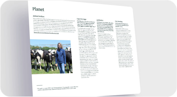 Planet Animal Welfare Cage Free Eggs Antibiotics Sow Housing Just as with our coffee, Starbucks goal is for everything we sell to be produced FY21 Results: In the U.S. and Europe, FY21 Results: As of 2018, all poultry FY21 Results: Developed plan under high quality and ethical standards. For the food and dairy we serve, 100% of shelled eggs are certified featured in Starbucks products in to phase out excessive use of this means a commitment to social responsibility standards with animal cage-free. In the U.S., 99.3% of stores in the U.S. is raised without gestation stalls. 24 welfare as a primary focus. We are committed to working with and buying liquid eggs are certified cage-free. the routine use of antibiotics. We In December 2021, Starbucks from farmers and suppliers who share our commitment to humane practices Since Starbucks first began buying work closely with our suppliers to released an updated sow housing throughout an animal’s lifecycle. FY21 has brought a renewed focus on Animal cage-free eggs in 2008, we have continue to ensure they meet this commitment for North America. Welfare, and we have launched an internal Animal Welfare working group and made significant progress, increasing commitment. Starbucks is phasing out the steering committee to continue to improve our commitments. Please view our purchases year-over-year. In Starbucks engaged with our excessive use of gestation stalls for Starbucks Animal Welfare-Friendly practices. FY21, Starbucks received a Good Egg suppliers and set a goal to serve the sows (mother pig) in our supply award from Compassion in World only poultry raised without the chain by 2030. The excessive use Farming’s 2021 Egg Track Report for routine use of medically important of gestation stalls would include the progress we’ve made against our antibiotics in all company-operated stalls where gestating sows do not cage-free egg commitment in the U.S. stores by 2020. In 2018, we have the ability to turn around. U.S. and Europe. In FY21, all of the met that goal two years ahead of This commitment extends to shelled eggs we use in our products schedule. The poultry we serve has all Starbucks branded products, in the U.S. and Europe are certified been raised without the routine use including those supplied to our cage-free, and all of the liquid eggs of antibiotics. licensee business partners in the we use in Europe and 99.3% of the U.S. and Canada. To reach our goal liquid eggs used in the U.S. are of phasing out the excessive use certified cage-free. While there have of gestation stalls, we will specify been great strides in availability of 100% “group-housed” pork as a the cage-free egg supply in the U.S. requirement of our pork suppliers and Europe, there is still work to be in the U.S. and Canada and take done across the industry to increase steps to ensure a “group-housed” supply to address market availability pork supply in 2024. We expect to globally. In Asian company-operated demonstrate meaningful progress markets such as China and Japan, towards this goal in 2023. Group the production of cage-free eggs is housing will significantly reduce a not widespread and supply is not sow’s time in a gestation stall. yet available at scale. Starbucks will continue to engage and consult with industry stakeholders on increasing the available supply in order to achieve our goal for company- operated stores. 24 Our goal is to source 100% cage-free eggs globally. The geographic scope of this data point includes all company-owned and operated markets in the U.S. and Europe.