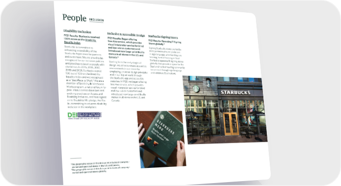 People INCLUSION Disability Inclusion Inclusive & Accessible Design Starbucks Signing Stores FY21 Results: Starbucks received FY21 Results: Began offering FY21 Results: Operating 11 Signing 9 100% score on the Disability free Aira service, which provides Stores globally. Equality Index. visual interpreter service for blind Signing Starbucks stores are led by Starbucks is committed to and low-vision customers and store partners who are proficient enhancing accessibility of the introduced new large-print Braille in sign language, whether they are Starbucks Experience for partners menus in all stores in the U.S. and hearing, hard of hearing or Deaf. 8 and customers. We are proud to be Canada. Starbucks operates 11 signing stores recognized for our inclusion policies Starting from the early stages of globally that provide a space for the and practices related to people with design, we strive to create accessible Deaf and hard of hearing community disabilities. In 2015, 2016, 2017, environments in our stores by to connect through sign language 2019 and 2021, Starbucks scored employing universal design principles and celebrate Deaf culture. 100 out of 100 on the Disability and in our digital world through Equality Index and was recognized the Starbucks app and accessible as a “Best Place to Work.” We are a websites. In FY21, we began offering member of Disability:IN’s Inclusion free Aira service, which provides Works program, a national forum for visual interpreter service for blind peer institutions to share best and and low-vision customers and evolving practices on Access and introduced new large-print Braille Disability Inclusion, and have signed menus in all stores in the U.S. and on to Disability:IN’s pledge, Are You Canada. In, committing to advance disability inclusion in the workplace. 8 The geographic scope of this data point includes all company- owned and operated stores in the U.S. and Canada. 9 The geographic scope of this data point includes all company- owned and operated stores globally.