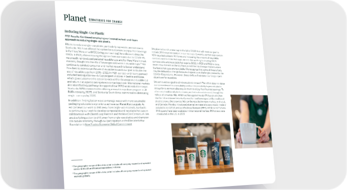 STRATEGIES FOR CHANGE Planet Reducing Single-Use Plastic FY21 Results: Continued employing our innovative test-and-learn approach to reducing single-use plastic. Efforts to reduce single-use plastic, particularly cup waste, are not new to We plan to launch a new cup in the fall of 2022 that will meet our goal to Starbucks. We have offered the option for customers to enjoy their beverage include 20% recycled content in our hot cups. Currently, our hot cups contain in For Here Ware or to BYOC (bring your own cup) for a discount since the 10% recycled content. While we are increasing the amount of recyclable 1980s. In FY21, after removing the option from our stores due to COVID-19, content used to make hot cups, we are also working to develop 100% we proudly reintroduced personal reusable cups and For Here Ware in most compostable and recyclable hot cups by 2022. In FY21 and FY22 to date, 22 markets, though less than 1% of beverages sold were in reusable cups. We seven new markets in the U.S. have joined the list of major markets where continue to conduct consumer and market research to better understand Starbucks hot cups are recyclable. We recognize that some of these efforts how best to incentivize the use of reusables towards our goal to double the may be delayed or change because of operational challenges created by the use of reusable cups from 2016-2022. In FY21, our test-and-learn approach COVID-19 pandemic. However, these shifts will not deter our longer-term included testing a Borrow-A-Cup program in stores in Seattle and Korea, objectives for reusables. which gave customers the option to receive their beverage in a reusable cup 23 and return it at a participating store’s contactless kiosk. International markets We achieved our goal to eliminate plastic straws. This effort does not deter also identified key pathways in support of our 2030 waste reduction target. our commitment to accessibility and our responsibility to provide plastic Starbucks EMEA committed to offering a reusable cup share program in all straws for customers who require them to enjoy their favorite beverage. To EMEA stores by 2025, and Starbucks South Korea committed to eliminating eliminate traditional plastic straws, we first reduced demand, through the single-use cups by 2025. rollout of strawless lids, which we has approximately 9% less plastic than the flat lid and straw historically used for iced beverages. Unlike traditional In addition, finding better ways to manage waste with more sustainable plastic straws, the strawless lids can be recycled in many markets in the U.S. packaging solutions is a priority to achieve our Planet Positive goals. As and Canada. We also introduced alternative material straws mostly made of we continue our work to shift away from single-use materials, Starbucks polylactic acid (PLA) and polyhydroxyalkanoate (PHA). While some PLA and is continuing our work to develop compostable and recyclable hot cups in PHA straws have been available in international markets, PHA straws were collaboration with Closed Loop Partners and the NextGen Consortium. We introduced in the U.S. in 2021. are also taking action to shift away from single-use plastics and champion the circular economy through our participation in the Ellen MacArthur Foundation’s New Plastics Economy Global Commitment. 22 The geographic scope of this data point includes all company-owned and operated stores in the US and licensed operations in Korea. 23 The geographic scope of this data point includes all company-owned and operated markets globally.