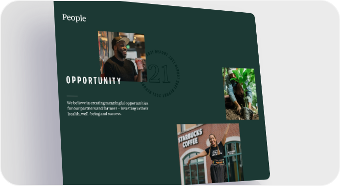 People 021 REPORT 2 T 2 02 OR 1 R EP E 1 R PO 20 TR 2T 02 OPPORTUNITY RO 12 PER PER 1202TRO We believe in creating meaningful opportunities for our partners and farmers — investing in their health, well-being and success. ESG Report | Starbucks Page 4 Page 6Video Player is loading.Play VideoPlaySkip BackwardSkip ForwardMuteCurrent Time 0:00/Duration 2:11Loaded: 0.00%0:00Stream Type LIVESeek to live, currently behind liveLIVERemaining Time -2:11 1xPlayback RateChaptersChaptersDescriptionsdescriptions off, selectedCaptionscaptions settings, opens captions settings dialogcaptions off, selectedAudio TrackPicture-in-PictureFullscreenThis is a modal window.Beginning of dialog window. Escape will cancel and close the window.TextColorWhiteBlackRedGreenBlueYellowMagentaCyanOpacityOpaqueSemi-TransparentText BackgroundColorBlackWhiteRedGreenBlueYellowMagentaCyanOpacityOpaqueSemi-TransparentTransparentCaption Area BackgroundColorBlackWhiteRedGreenBlueYellowMagentaCyanOpacityTransparentSemi-TransparentOpaqueFont Size50%75%100%125%150%175%200%300%400%Text Edge StyleNoneRaisedDepressedUniformDrop shadowFont FamilyProportional Sans-SerifMonospace Sans-SerifProportional SerifMonospace SerifCasualScriptSmall CapsResetDoneClose Modal DialogEnd of dialog window.