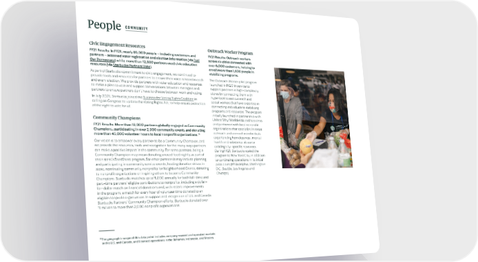 People COMMUNITY Civic Engagement Resources Outreach Worker Program FY21 Results: In FY21, nearly 85,000 people – including customers and FY21 Results: Outreach workers partners – accessed voter registration and election information (via Fuel across six cities connected with Our Democracy) while more than 12,500 partners used civic education over 6,000 customers, helping to resources (via Starbucks Partners Vote). enroll more than 1,600 people in As part of Starbucks commitment to civic engagement, we continued to stabilizing programs. provide tools and resources for partners to ensure their voice is heard in each The Outreach Worker pilot program and every election. We provide partners with voter education and resources launched in FY20 in service to to make a plan to vote and support conversations between managers and support partners in high-complexity partners to ensure partners don’t have to choose between work and voting. stores by connecting them with In July 2021, Starbucks joined the Business for Voting Rights Coalition in hyperlocal street outreach and calling on Congress to update the Voting Rights Act, to help ensure protection social workers that have expertise in of the right to vote for all. connecting individuals to stabilizing programs and resources. The program initially launched in partnership with Community Champions United Way Worldwide and has since FY21 Results: More than 18,000 partners globally engaged as Community and partnered with local nonprofit Champions, participating in over 2,900 community events and donating organizations that specialize in street more than 45,000 volunteer hours to local nonprofit organizations.15 outreach and connect in individuals experiencing homelessness, mental Our vision is to empower every partner to be a Community Champion, and health and substance abuse to we provide the resources, tools and recognition for the many ways partners existing city-specific resources. can make a positive impact in the community. For some partners, being a During FY21, Starbucks scaled the Community Champion may mean donating unused food nightly as part of program to New York City, in addition their store’s FoodShare program. F or other partners it may include planning to continuing operations in its initial and participating in community service events, hosting donation drives in pilot cities (Philadelphia, Washington store, nominating community nonprofits for Neighborhood Grants, donating D.C., Seattle, Los Angeles and to nonprofit organizations or inspiring others to become Community Chicago). $ Champions. Starbucks matches up to 1,000 annually for both full-time and part-time partners’ eligible contributions to nonprofits, including a dollar- for-dollar match on financial donations and, with recent improvements in the program, a match for every hour of volunteer time donated to an eligible nonprofit organization . In support and recognition of U.S. and Canada Starbucks Partners’ Community Champion efforts, Starbucks donated over $ 1 million to more than 2,000 nonprofit organizations. 15 The geographic scope of this data point includes company-owned and operated markets in the U.S. and Canada, and licensed operations in the Bahamas, Indonesia, and Mexico.