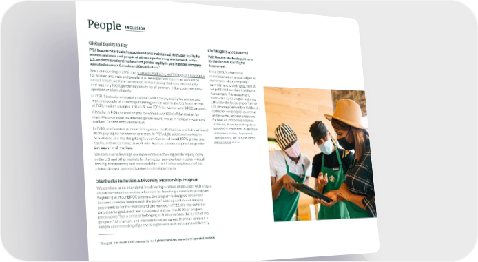 People INCLUSION Global Equity in Pay Civil Rights Assessment FY21 Results: Starbucks has achieved and maintained 100% pay equity for FY21 Results: Starbucks published women and men and people of all races performing similar work in the its third annual Civil Rights U.S. and achieved and maintained gender equity in pay in global company- Assessment. 7 operated markets Canada and Great Britain. Since 2019, Starbucks has Since announcing in 2018 that Starbucks had achieved 100 percent pay equity commissioned an annual, objective for women and men and people of all races performing similar work in the assessment of our company’s United States, we have committed to maintaining that standard annually commitment to civil rights. In FY21, and reaching 100% gender pay equity for all partners in Starbucks company- we published our third Civil Rights operated markets globally. Assessment. This assessment, In FY21, Starbucks once again maintained 100% pay equity for women and conducted by Covington & Burling men and people of all races performing similar work in the U.S. As of the end LLP under the leadership of former of FY21, median pay ratio in the U.S. was 100% for women and BIPOC partners. U.S. Attorney General Eric Holder, Jr., addresses our progress over time Globally, in FY21 the median pay for women was 100% of the median for and provides recommendations men. We once again maintained gender equity in pay in company-operated for how we can better advance markets Canada and Great Britain. inclusion, diversity and equity on In FY20, our licensed partners in Singapore, the Philippines and India achieved behalf of our partners, customers 100% pay equity for women and men. In FY21, eight additional markets in and communities. To promote Asia-Pacific and the Hong Kong Support Center achieved 100% gender pay transparency, we publish these equity, and we continue to work with licensed partners to prioritize gender assessments online. pay equity in all markets. We continue to leverage our experience in achieving gender equity in pay in the U.S. and other markets by sharing our pay-equity principles — equal footing, transparency and accountability — with other employers to help address known, systemic barriers to global pay equity. Starbucks Inclusion & Diversity Mentorship Program We continue to be intentional in cultivating a culture of inclusion, with a focus on partner retention and development by launching a mentorship program. Beginning with our BIPOC partners, the program is designed to connect partners to senior leaders with the goal of creating continuous learning opportunities for the mentor and the mentee. In FY22, the first cohort of participants graduated, and survey results show that 100% of program participants “feel a sense of belonging at Starbucks since the launch of the program.” All mentors and mentees surveyed agreed that they achieved a deeper understanding of partners’ experience with inclusion and diversity. 7 Our goal is to reach 100% pay equity in all global company-owned and operated markets.