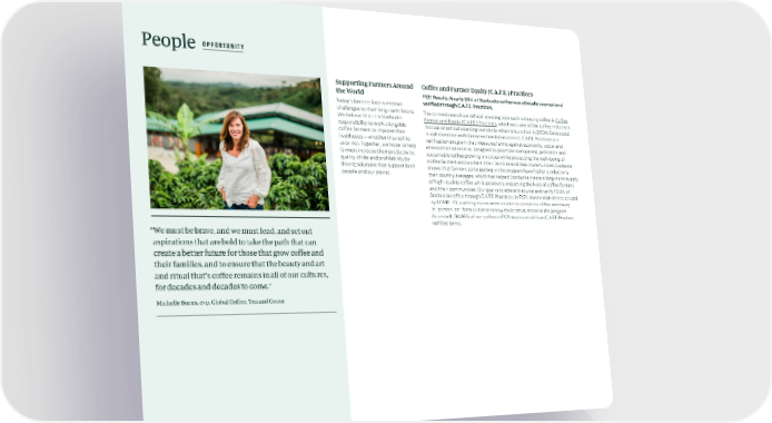 People OPPORTUNITY Supporting Farmers Around Coffee and Farmer Equity (C.A.F.E.) Practices the World FY21 Results: Nearly 95% of Starbucks coffee was ethically sourced and Today’s farmers face numerous verified through C.A.F.E. Practices. challenges to their long-term future. The cornerstone of our ethical sourcing approach to buying coffee is Coffee We believe that it is Starbucks Farmer and Equity (C.A.F.E.) Practices, which was one of the coffee industry’s responsibility to work alongside first set of ethical sourcing standards when it launched in 2004. Developed coffee farmers to improve their in collaboration with Conservation International, C.A.F.E. Practices is a livelihoods – whether they sell to verification program that measures farms against economic, social and us or not. Together, we hope to help environmental criteria, designed to promote transparent, profitable and farmers increase their productivity, sustainable coffee growing practices while protecting the well-being of quality of life and profitability by coffee farmers and workers, their families and their communities. Evidence driving solutions that support both shows that farmers participating in the program have higher productivity people and our planet. than country averages, which has helped Starbucks create a long-term supply of high-quality coffee while positively impacting the lives of coffee farmers and their communities. Our goal is to ethically source and verify 100% of Starbucks coffee through C.A.F.E. Practices. In FY21, due to restrictions caused by COVID-19, auditing teams were unable to complete all the necessary in-person, on-farm audits to renew their active status in the program. As a result, 94.86% of our coffee in FY21 was sourced from C.A.F.E. Practice- verified farms. “We must be brave, and we must lead, and set out aspirations that are bold to take the path that can create a better future for those that grow coffee and their families, and to ensure that the beauty and art and ritual that’s coffee remains in all of our cultures, for decades and decades to come.” Michelle Burns, evp, Global Coffee, Tea and Cocoa