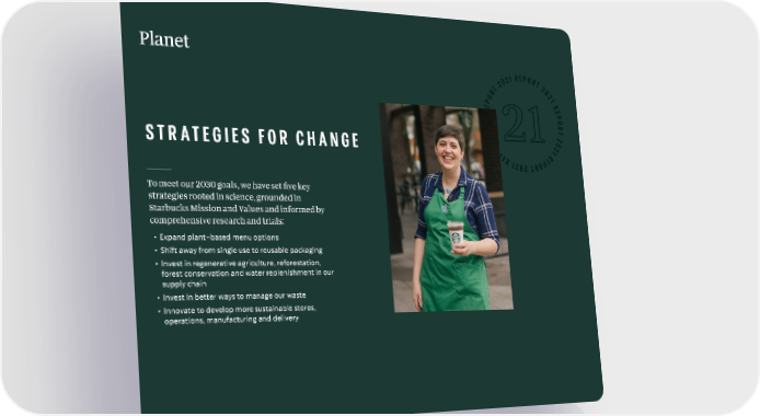 Planet 021 REPORT 2 T 2 02 OR 1 R EP E 1 R PO 20 TR 2T 02 STRATEGIES FOR CHANGE RO 12 PER PER 1202TRO To meet our 2030 goals, we have set five key strategies rooted in science, grounded in Starbucks Mission and Values and informed by comprehensive research and trials: • Expand plant-based menu options • Shift away from single use to reusable packaging • I nvest in regenerative agriculture, reforestation, forest conservation and water replenishment in our supply chain • Invest in better ways to manage our waste • I nnovate to develop more sustainable stores, operations, manufacturing and delivery