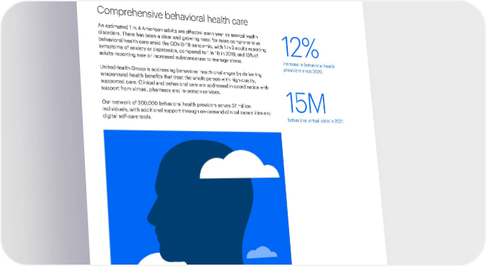 Introduction 23 2021 Sustainability Report A Modern, High-Performing Health System Our People and Culture Environmental Health Responsible Business Practices Performance Data Comprehensive behavioral health care An estimated 1 in 4 American adults are affected each year by mental health disorders. There has been a clear and growing need for more comprehensive behavioral health care amid the COVID-19 pandemic, with 1 in 3 adults reporting symptoms of anxiety or depression, compared to 1 in 10 in 2019, and 13% of adults reporting new or increased substance use to manage stress. UnitedHealth Group is addressing behavioral health challenges by delivering wraparound health benefits that treat the whole person with high-quality, supported care. Clinical and behavioral care are addressed in coordination with support from virtual, pharmacy and in-person services. Our network of 300,000 behavioral health providers serves 37 million individuals, with additional support through on-demand clinical capabilities and digital self-care tools. 12% increase in behavioral health providers since 2020. 15M behavioral virtual visits in 2021.