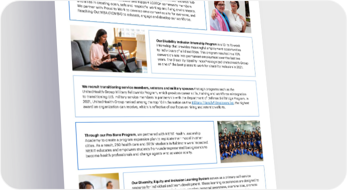 Our People and Culture 73 2021 Sustainability Report A Modern, High-Performing Health System Introduction Responsible Business Practices Performance Data Environmental Health We support the LGBTQ+ community by partnering with organizations that support LGBTQ+ equality, and by offering benefits like Pride365+ , an online resource hub that features resources to educate and support LGBTQ+ community members and allies in creating open, safe and respectful working and living environments. We partner with Proud to Work to develop employment equity for everyone, and Reaching Out MBA (ROMBA) to educate, engage and develop our workforce. Our Disability Inclusion Internship Program is a 12- to 15-week internship that provides meaningful employment opportunities to individuals of all disabilities. This program resulted in a 70% conversion rate into permanent employment over the last two years. The Disability Equality Index® recognized UnitedHealth Group as one of the best places to work for disability inclusion in 2021. We recruit transitioning service members, veterans and military spouses through programs such as the UnitedHealth Group Military Fellowship Program, which provides career skills, training and workforce reintegration to transitioning U.S. military service members in partnership with the Department of Defense SkillBridge Program. In 2021, UnitedHealth Group ranked among the top 10 in the nation on the Military Friendly® Employers list , the highest award an organization can receive, which is reflective of our focus on hiring and retention efforts. Through our Pro Bono Program , we partnered with MERIT Health Leadership Academy to create a program expansion plan to replicate their model in other cities. As a result, 250 health care and STEM students in Baltimore were impacted. MERIT educates and empowers students from underrepresented backgrounds to become health professionals and change agents who advance equity. Our Diversity, Equity and Inclusion Learning System serves as a primary self-service resource for individual and team development. These learning experiences are designed to build inclusive leadership behaviors, develop personal awareness, examine bias, promote allyship, and grow resilience and resourcefulness. We promote education, ongoing dialogue, connection and awareness to mitigate the effects of unwelcome bias, and we support an environment where every employee can bring their authentic self to work.