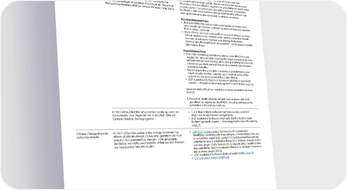 109 2021 Sustainability Report Responsible Business Practices Performance Data Our People and Culture A Modern, High-Performing Health System Introduction Environmental Health Topic Code/Metric UnitedHealth Group Disclosure Improved Outcomes HC-MC-260a.2 Total coverage for preventive health services with no cost sharing for the enrollees, total coverage for preventive health services requiring cost sharing by the enrollee, percentage of enrollees receiving Initial Preventive Physical Examinations (IPEE) or Annual Wellness Visits (AWV) UnitedHealthcare covers certain medical services under the preventive care services benefit. The federal Patient Protection and Affordable Care Act (PPACA) requires non-grandfathered health plans to cover certain “recommended preventive services” as identified by PPACA under the preventive care services benefit, without cost sharing to members when provided by network providers. Non-Grandfathered Plans • Non-gr andfathered plans provide coverage for preventive care services with no member cost sharing when services are obtained from a network provider. • U nder PPACA, services obtained from an out-of-network provider are not required to be covered under a plan’s preventive benefit and may be subject to member cost sharing. Refer to the member-specific benefit plan document for out-of-network benefit information, if any. Grandfathered Plans • Plans that maint ain grandfathered status under PPACA are not required by law to provide coverage for these preventive services without member cost sharing, although a grandfathered plan may choose to voluntarily amend its plan document to include these preventive benefits. • E xcept where there are state mandates, a grandfathered plan might include member cost sharing, or exclude some of the preventive care services identified under PPACA. • 2 021 Sustainability Report: A Modern, High Performing Health System — Preventive Services Long-Term Commitment, page 36 . Approximately 69% of our members received preventive services in 2021. 1 1. Pr eventive health services defined in accordance with AMA guidelines as required by the PPACA, including wellness visits, preventive visits and vaccinations. HC-MC-260a.3 Number of customers receiving care from Accountable Care Organizations or enrolled in Patient- Centered Medical Home programs • 1 4.4 million UnitedHealthcare members access care from physicians in value-based arrangements. • 2 021 Sustainability Report: Helping to Build a Modern, High- Performing Health System — Improving Health Care Affordability, page 37 . Climate Change Impacts on Human Health HC-MC-450a.1 Discussion of the strategy to address the effects of climate change on business operations and how specific risks presented by changes in the geographic incidence, morbidity, and mortality of illnesses and diseases are incorporated into risk models • CDP 2 020 Questionnaire : Section C2.2 Process(es) for identifying, assessing and responding to climate-related risks and opportunities, pages 9-12; Section C2.3a Risks identified with the potential to have a substantive financial or strategic impact on the business, pages 17-25; Section C2.4a Opportunities identified with the potential to have a substantive financial or strategic impact on the business, pages 25-33. • 2 021 Sustainability Report: Environmental Health, page 59 . • En vironmental Impact Statement .
