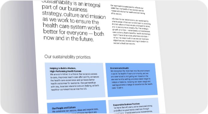 Introduction Our People and Culture Environmental Health 12 2021 Sustainability Report A Modern, High-Performing Health System Responsible Business Practices Performance Data Sustainability at UnitedHealth Group Sustainability is an integral part of our business strategy, culture and mission as we work to ensure the health care system works better for everyone — both now and in the future. Our approach to sustainability reflects our belief that the health of any society can be measured only by the health and well-being of its people. Informed by our stakeholders, our sustainability priority areas reflect our commitment to providing distinct value to those we are privileged to serve, and to society more broadly. Our five strategic growth priorities — value-based, comprehensive care delivery; health benefits; health technology; health financial services; pharmacy services — reflect the ways in which we see our business objectives and mission working in tandem to support a healthier society. Our sustainability priorities Environmental Health We recognize the important role the environment plays in the health of every community, and we are committed to mitigating our impact on the environment by setting a science-based target to reduce emissions, reducing our paper usage and leading systemic change to decarbonize the health care industry. Helping to Build a Modern, High-Performing Health System We are committed to a future that expands access to care, improves health care affordability, enhances the health care experience and achieves better health outcomes for everyone. Our partnerships with key, localized stakeholders are helping us build healthier communities across the U.S. Our People and Culture We celebrate our people, ideas and experiences, creating a culture where all team members are appreciated, valued and able to reach their full potential. We join together as individuals — forming a team as diverse as the people we serve — in meeting our responsibility to improve the health system and building the health workforce with a diverse pipeline of talent. Responsible Business Practices For more than 40 years, we’ve developed strong and effective governance practices through compliance, board diversity and independence, a commitment to ethics and integrity, and an emphasis on data security and supply chain management.