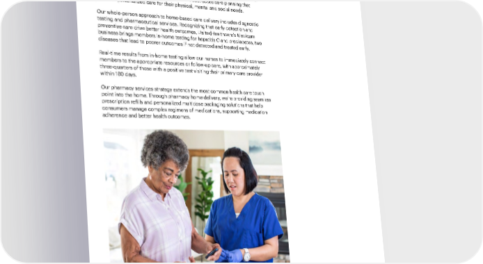 Introduction 34 2021 Sustainability Report A Modern, High-Performing Health System Our People and Culture Environmental Health Responsible Business Practices Performance Data For those transitioning home from the hospital, our post-acute care planning and coordination works to bring together physician advisory services, hospital medicine, emergency medicine and transition care to help individuals recover faster. Nearly 10 million people benefit from post-acute care planning that provides personalized care for their physical, mental and social needs. Our whole-person approach to home-based care delivery includes diagnostic testing and pharmaceutical services. Recognizing that early detection and preventive care drive better health outcomes, UnitedHealthcare’s Medicare business brings members in-home testing for hepatitis C and prediabetes, two diseases that lead to poorer outcomes if not detected and treated early. Real-time results from in-home testing allow our nurses to immediately connect members to the appropriate resources or follow-up care, with approximately three-quarters of those with a positive test visiting their primary care provider within 180 days. Our pharmacy services strategy extends the most common health care touch point into the home. Through pharmacy home delivery, we’re providing seamless prescription refills and personalized multidose packaging solutions that help consumers manage complex regimens of medications, supporting medication adherence and better health outcomes.