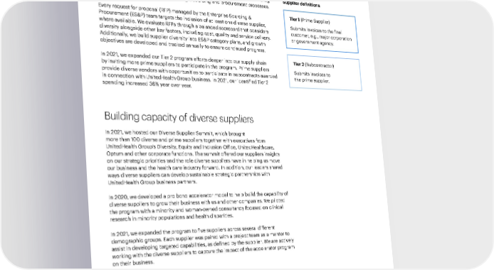 Our People and Culture 92 2021 Sustainability Report Responsible Business Practices A Modern, High-Performing Health System Introduction Performance Data Environmental Health Our process We recognize the importance of supplier diversity and are committed to ensuring diversity is an integral part of our strategic sourcing and procurement processes. Every request for proposal (RFP) managed by the Enterprise Sourcing & Procurement (ES&P) team targets the inclusion of at least one diverse supplier, where available. We evaluate RFPs through a balanced scorecard that considers diversity alongside other key factors, including cost, quality and service delivery. Additionally, we build supplier diversity into ES&P category plans, and growth objectives are developed and tracked annually to ensure continued progress. In 2021, we expanded our Tier 2 program efforts deeper into our supply chain by inviting more prime suppliers to participate in the program. Prime suppliers provide diverse vendors with opportunities to participate in subcontracts awarded in connection with UnitedHealth Group business. In 2021, our identified Tier 2 spending increased 36% year over year. Building capacity of diverse suppliers In 2021, we hosted our Diverse Supplier Summit, which brought more than 100 diverse and prime suppliers together with executives from UnitedHealth Group’s Diversity, Equity and Inclusion Office, UnitedHealthcare, Optum and other corporate functions. The summit offered our suppliers insights on our strategic priorities and the role diverse suppliers have in helping us move our business and the health care industry forward. In addition, our leaders shared ways diverse suppliers can develop sustainable strategic partnerships with UnitedHealth Group business partners. In 2020, we developed a pro bono accelerator model to help build the capability of diverse suppliers to grow their business with us and other companies. We piloted the program with a minority and woman-owned consultancy focused on clinical research in minority populations and health disparities. In 2021, we expanded the program to five suppliers across several different demographic groups. Each supplier was paired with a project team as a mentor to assist in developing targeted capabilities, as defined by the supplier. We are actively working with the diverse suppliers to capture the impact of the accelerator program on their business. Tier 1 (Prime Supplier) Submits invoices to the final customer, e.g., major corporation or government agency. Tier 2 (Subcontractor) Submits invoices to the prime supplier. Supplier definitions